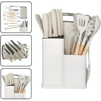 Kit 19 Peças Utensilios Cozinha Silicone Com Facas Antiaderente Cabo De Madeira Tratada Kit Com Colher Concha Espatula Pegador Tesoura Tabua - Jogo Completo Premium Branco Marmore.