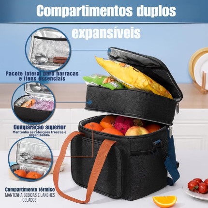 Bolsa Térmica Dupla Compartimento com Alça Ajustável, Azul Marinho com Detalhes Marrom, Múltiplos Bolsos