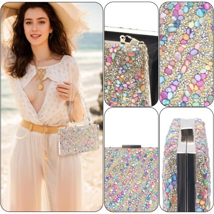 Bolsa Clutch Festa Feminina Full Diamond Com Pedras Coloridas Mão Ombro Transversal Com Correntes Removíveis