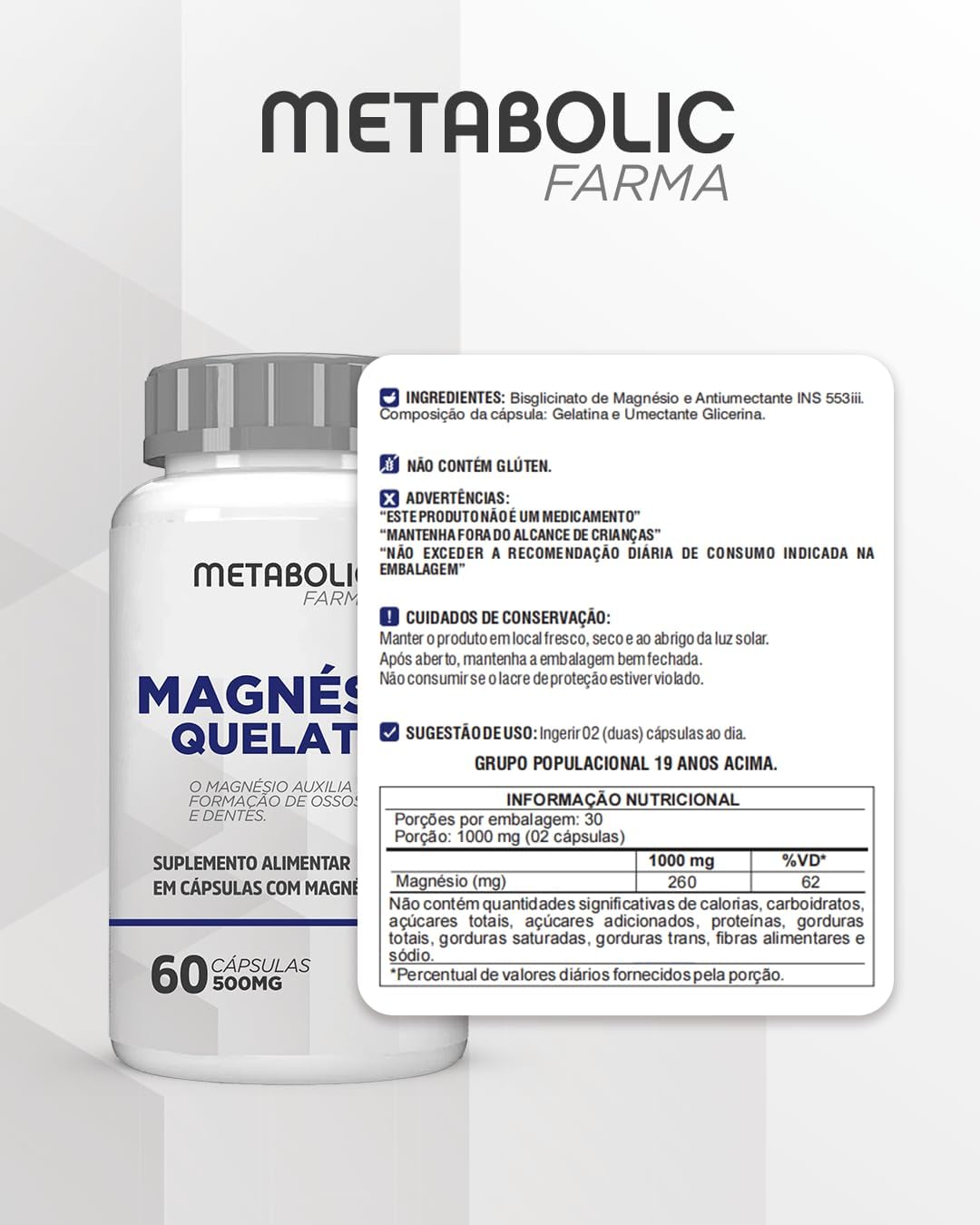 2x Magnésio Quelato Bisglicinato 500mg 120 cápsulas – Metabolic farma