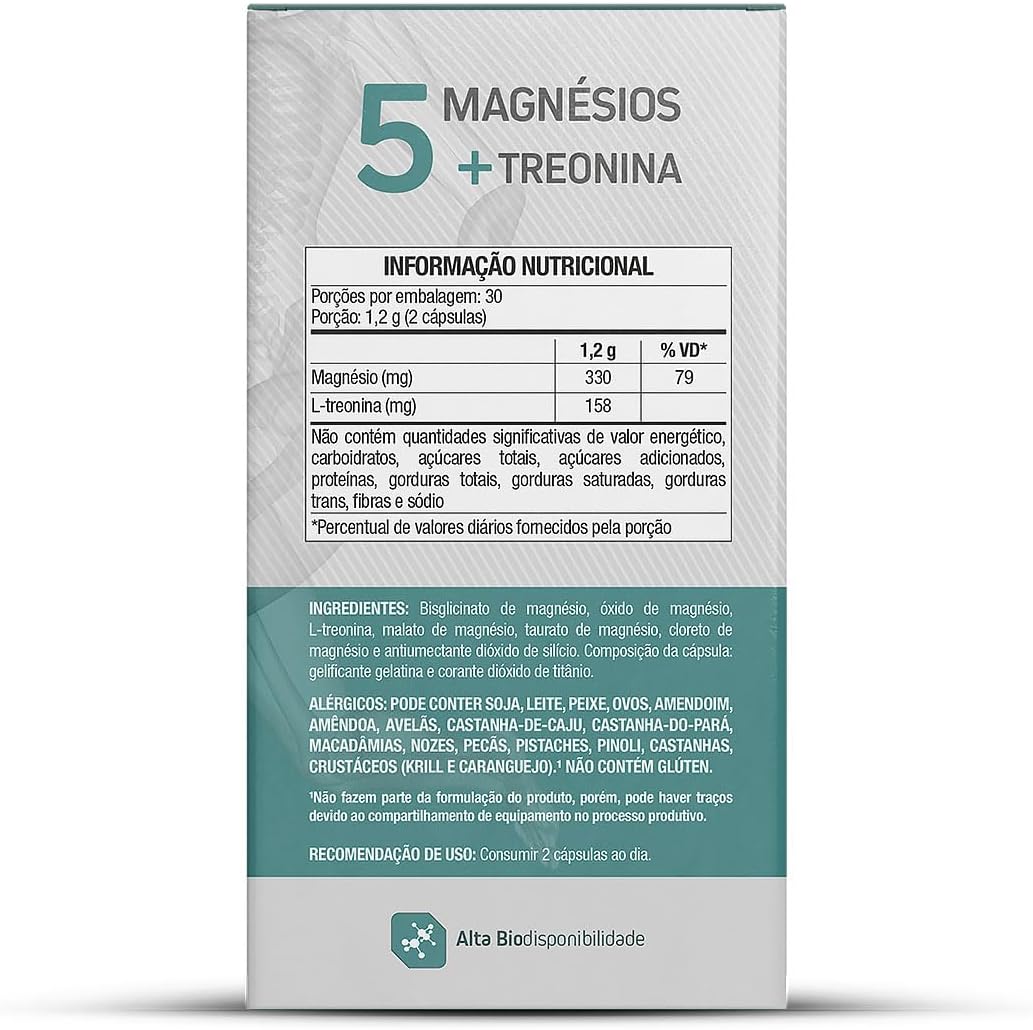 Bisglicinato de magnésio, óxido de magnésio, L-treonina, malato de magnésio, taurato de magnésio, cloreto de magnésio e antiumectante dióxido de silício. Composição da cápsula: gelatina e corante dióxido de titânio. ALÉRGICOS: PODE CONTER SOJA, LEITE, PEIXE, OVOS, CRUSTÁCEOS (KRILL E CARANGUEJO) E SEUS DERIVADOS. NÃO CONTÉM GLÚTEN. |