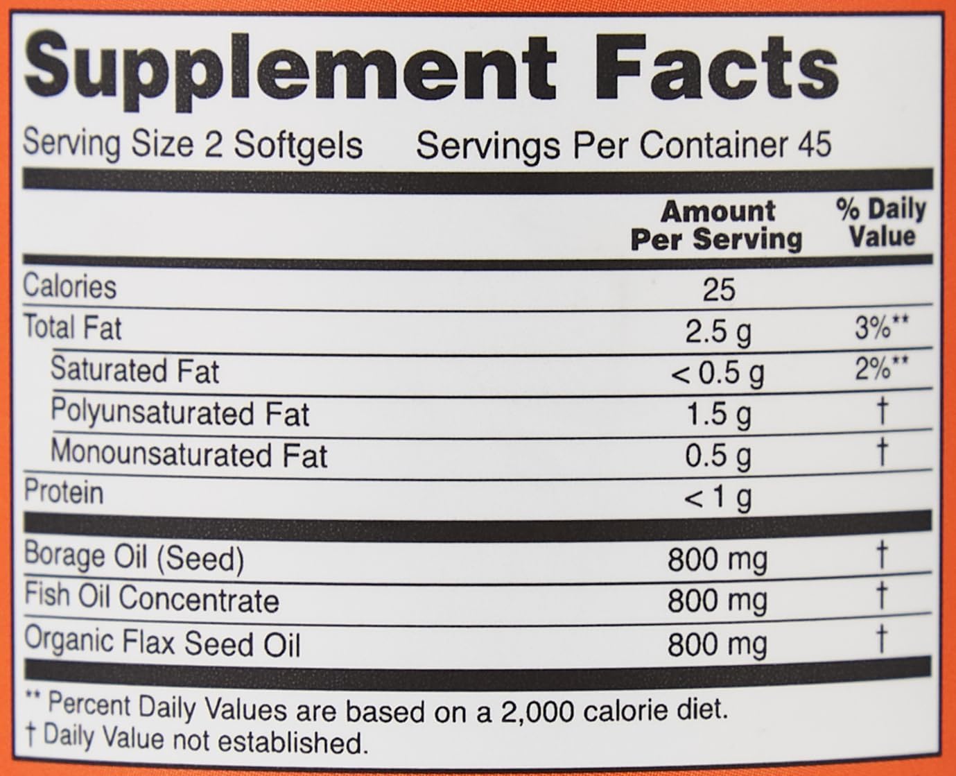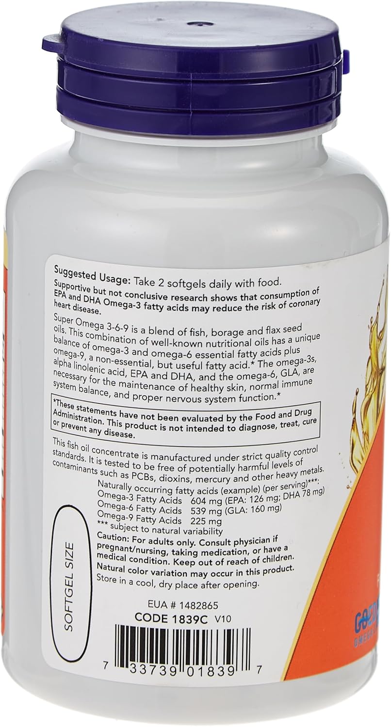 Os géis macios super ômega 369 da NOW Foods oferecem a bondade de todos os ácidos graxos para ajudar a saúde cardiovascular e o equilíbrio. Estes géis macios são ricos em ácidos graxos ômega3 ômega6 e ômega9 que ajudam a melhorar a saúde imunológica. Além disso, os ácidos graxos podem melhorar as respostas inflamatórias regulares do corpo. Os ácidos graxos ômega3 nessas cápsulas são processados a partir de peixes marinhos de água fria (ácido eicosapentaenóico EPA; e ácido docosahexaenóico DHA). O ácido gammalinolênico ômega6 (GLA) vem do óleo de borragem e o ácido oleico ômega9 é de óleo de semente de linho orgânico. Dietas com baixo teor de gordura podem levar a um desequilíbrio de ácidos graxos. O EPA e o DHA podem melhorar as prostaglandinas das séries 1 e 2, enquanto o GLA pode controlar o excesso de ácido linoleico na dieta. Juntos, eles podem equilibrar com sucesso as tarefas imunológicas normais. Os ácidos graxos ômega3 também podem desempenhar um papel importante na visão nítida e na manutenção dos níveis de lipoproteína no sangue. A cápsula NOW Foods pode fornecer a você a fonte natural de ácidos graxos do óleo de borragem de óleo de peixe e óleo de semente de linhaça. Restaure o equilíbrio em sua nutrição de ácidos graxos com os géis macios Super Omega 369 da Now. Estas declarações não foram avaliadas pela Food and Drug Administration (FDA). Estes produtos não são destinados a diagnosticar tratar ou curar qualquer doença ou condição médica. Consulte seu médico antes de iniciar qualquer programa de exercícios ou suplementos nutricionais ou antes de usar este ou qualquer produto durante a gravidez ou se você tiver uma condição médica séria.