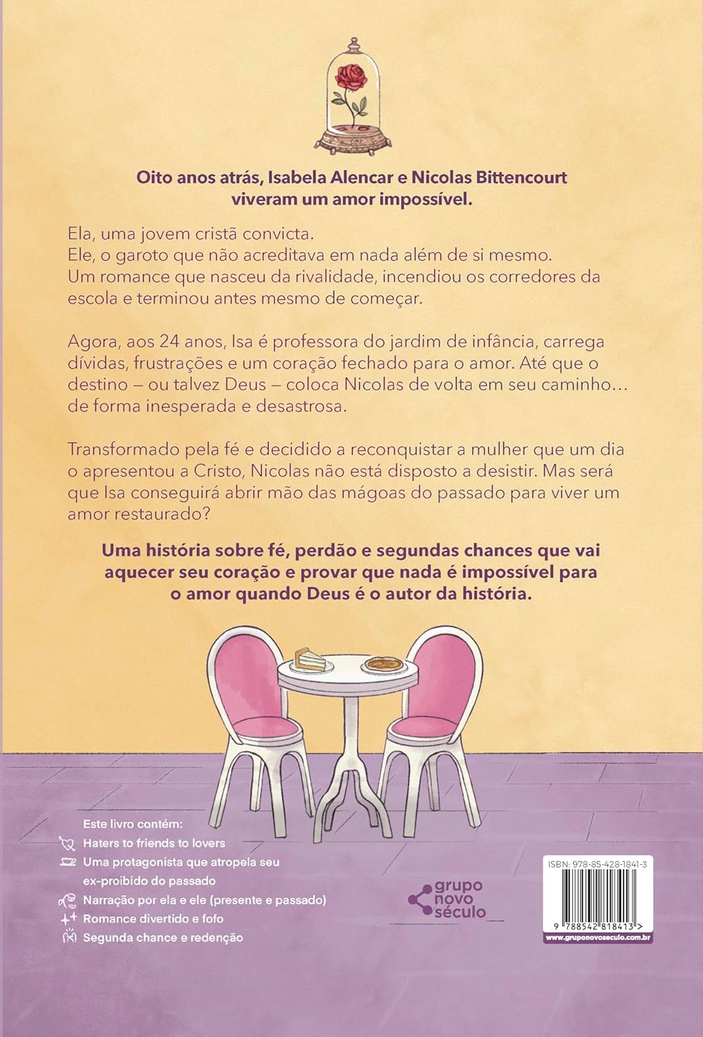 Oito anos atrás, Isabela Alencar e Nicolas Bittencourt viveram um amor impossível. Ela, uma jovem cristã convicta. Ele, o garoto que não acreditava em nada além de si mesmo. Um romance que nasceu da rivalidade, incendiou os corredores da escola e terminou antes mesmo de começar. Agora, aos 24 anos, Isa é professora do jardim de infância, carrega dívidas, frustrações e um coração fechado para o amor. Até que o destino ― ou talvez Deus ― coloca Nicolas de volta em seu caminho… de forma inesperada e desastrosa. Transformado pela fé e decidido a reconquistar a mulher que um dia o apresentou a Cristo, Nicolas não está disposto a desistir. Mas será que Isa conseguirá abrir mão das mágoas do passado para viver um amor restaurado? Uma história sobre fé, perdão e segundas chances que vai aquecer seu coração e provar que nada é impossível para o amor quando Deus é o autor da história. Destaques deste livro • Romance contemporâneo no estilo enemies to lovers • Narrativa leve, divertida e viciante • Casal com química intensa e diálogos afiados • Ideal para jovens adultos e adultos que amam comédias românticas • Este livro contém: • Hates to friends to lovers • Uma protagonista que atropela seu ex-proibido do passado • Narração por ela e ele (presente e passado) • Romance divertido e fofo • Segunda chance e redenção