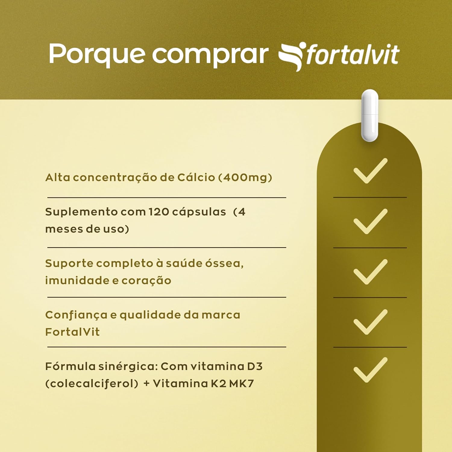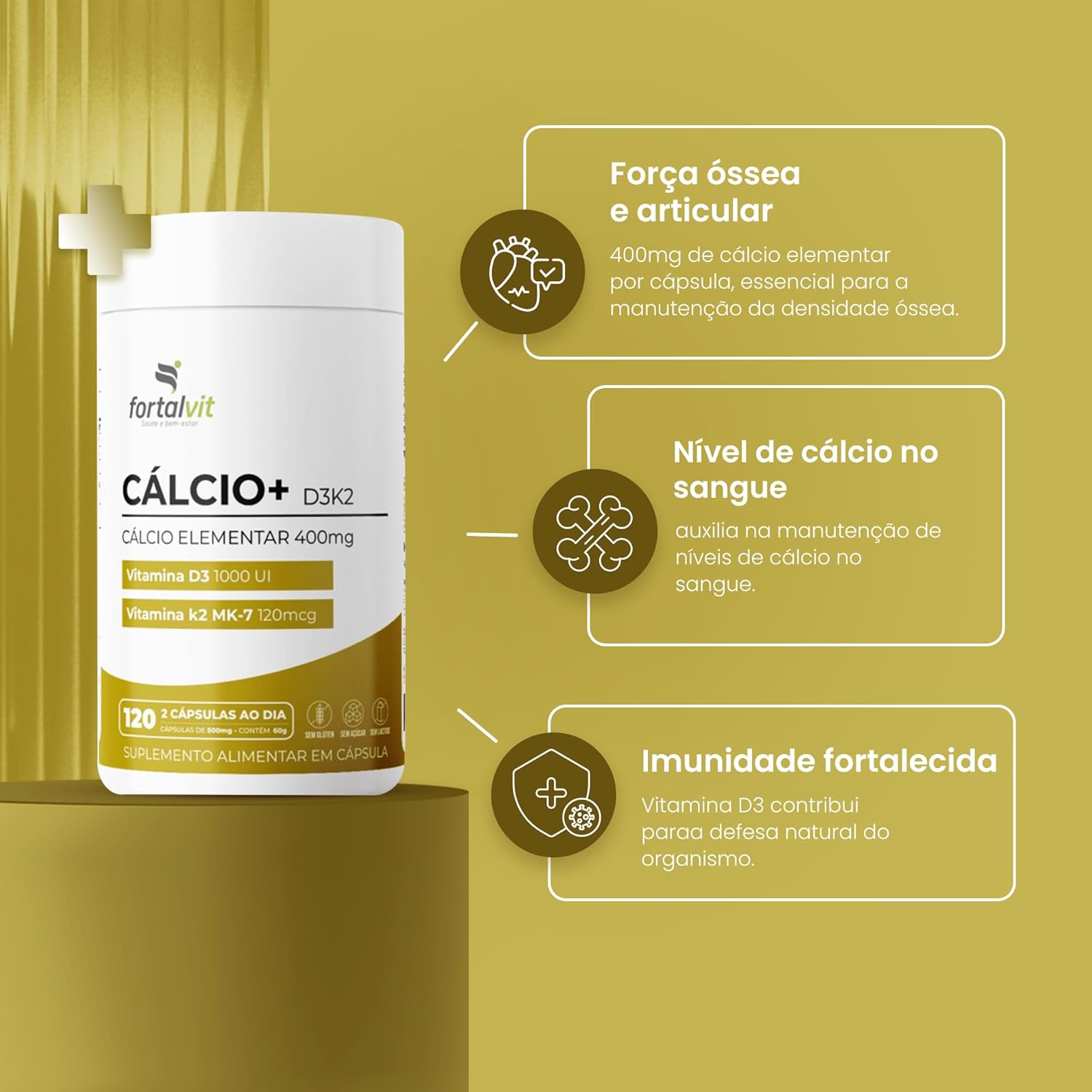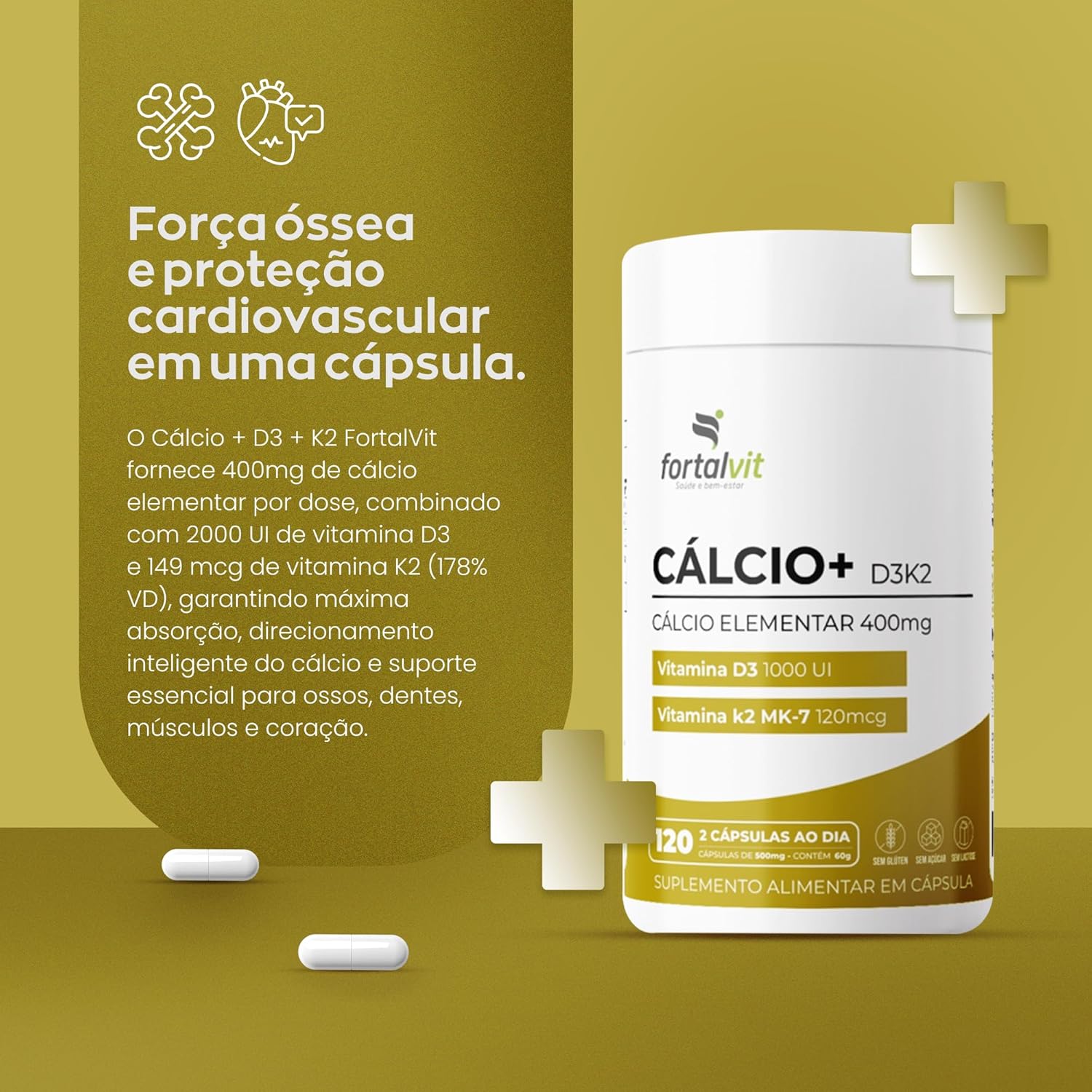 CÁLCIO + D3 K2 MK7-120 Cápsulas, Longa duração: 2 Meses de Uso – Cálcio Elementar (400mg) Vitamina D3, Vitamina K2-MK7, Fortalvit