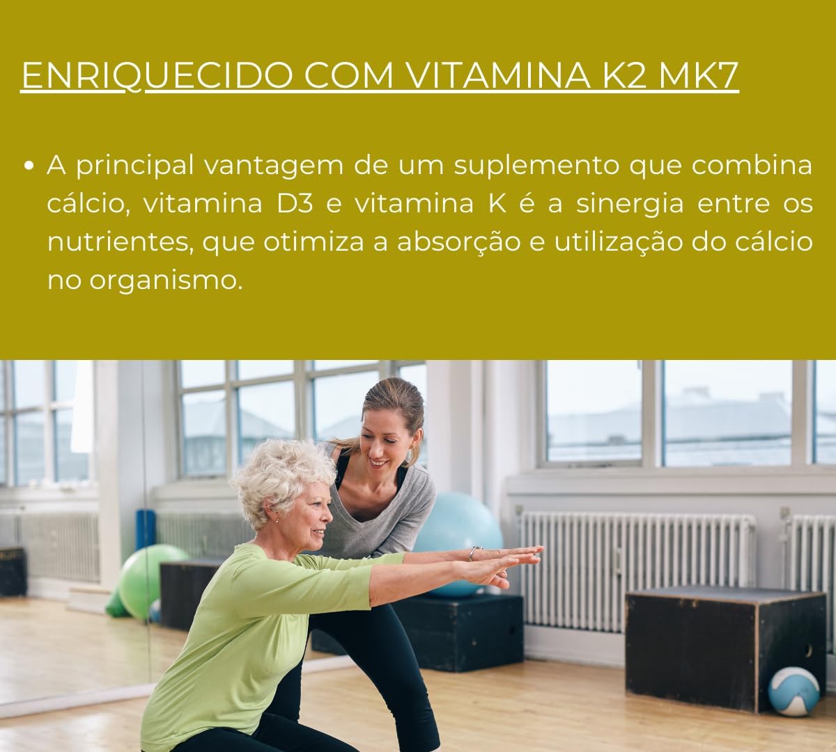 Nossa fórmula contém Carbonato de cálcio, colecalciferol (vitamina D3) e menaquinona (Vitamina K2). Ingredientes que atuam sinergicamente para garantir a máxima absorção do cálcio pelo organismo e direcioná-lo para os ossos, evitando que ele se deposite em outros tecidos.