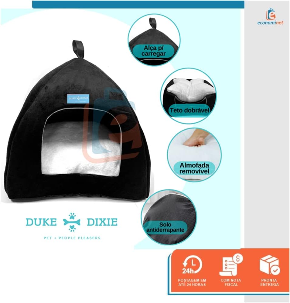 As caminhas pets da Duke & Dixie foram projetadas num formato de tenda e casa para cães e gatos usando um tecido suave e super confortável, veludo e poli espuma macio para dar todo o aconchego para o descanso do seu Pet.