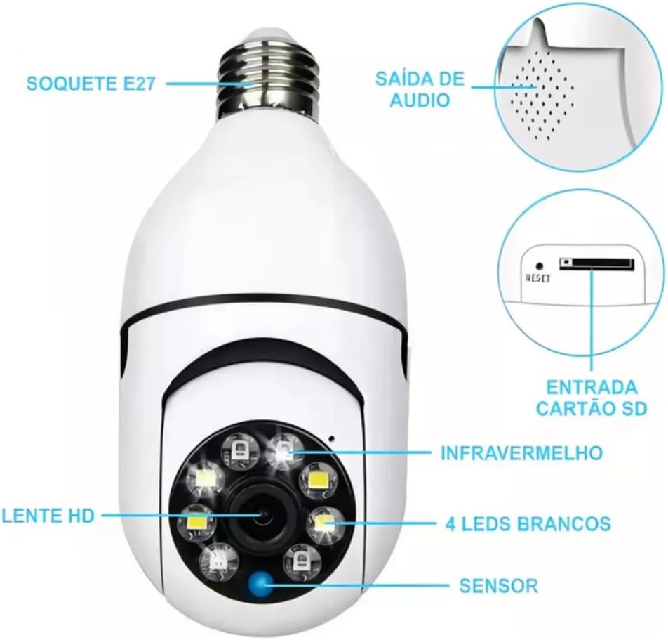 Com instalação simples diretamente no soquete de lâmpada E27, ela combina tecnologia de ponta com praticidade no dia a dia.Alimentação: 100V~240V (bivolt automático via bocal E27)Design Discreto em Formato de Lâmpada – Segurança eficiente sem chamar atenção.Controle Remoto pelo Celular – Veja imagens ao vivo, grave e receba alertas pelo aplicativo.Instalação Rápida e Fácil – Basta rosquear no bocal da lâmpada e conectar ao Wi-Fi.Proteção 24 Horas – Ideal para casas, apartamentos, lojas e escritórios.
