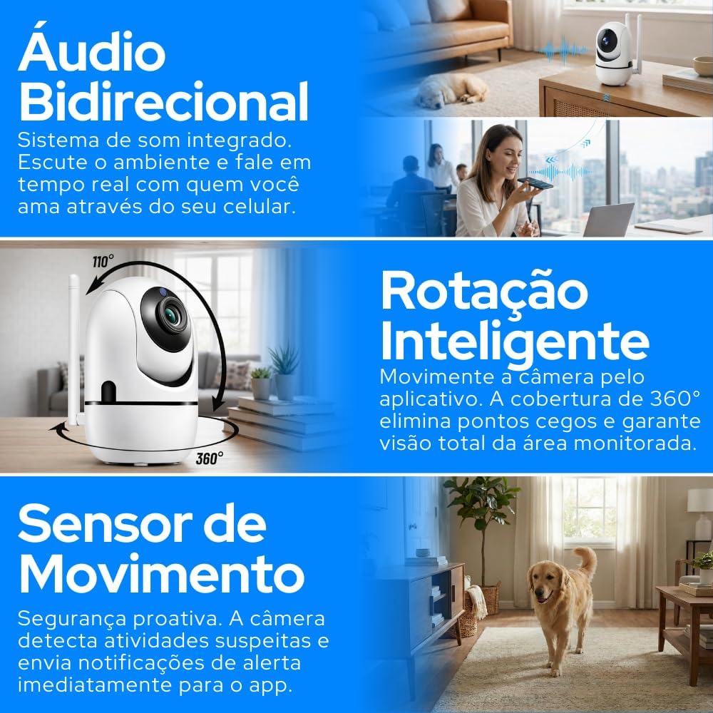 🎤 Áudio Bidirecional com Qualidade Cristalina: Microfone e alto-falante integrados com tecnologia anti-ruído – converse em tempo real com quem está do outro lado da câmera.