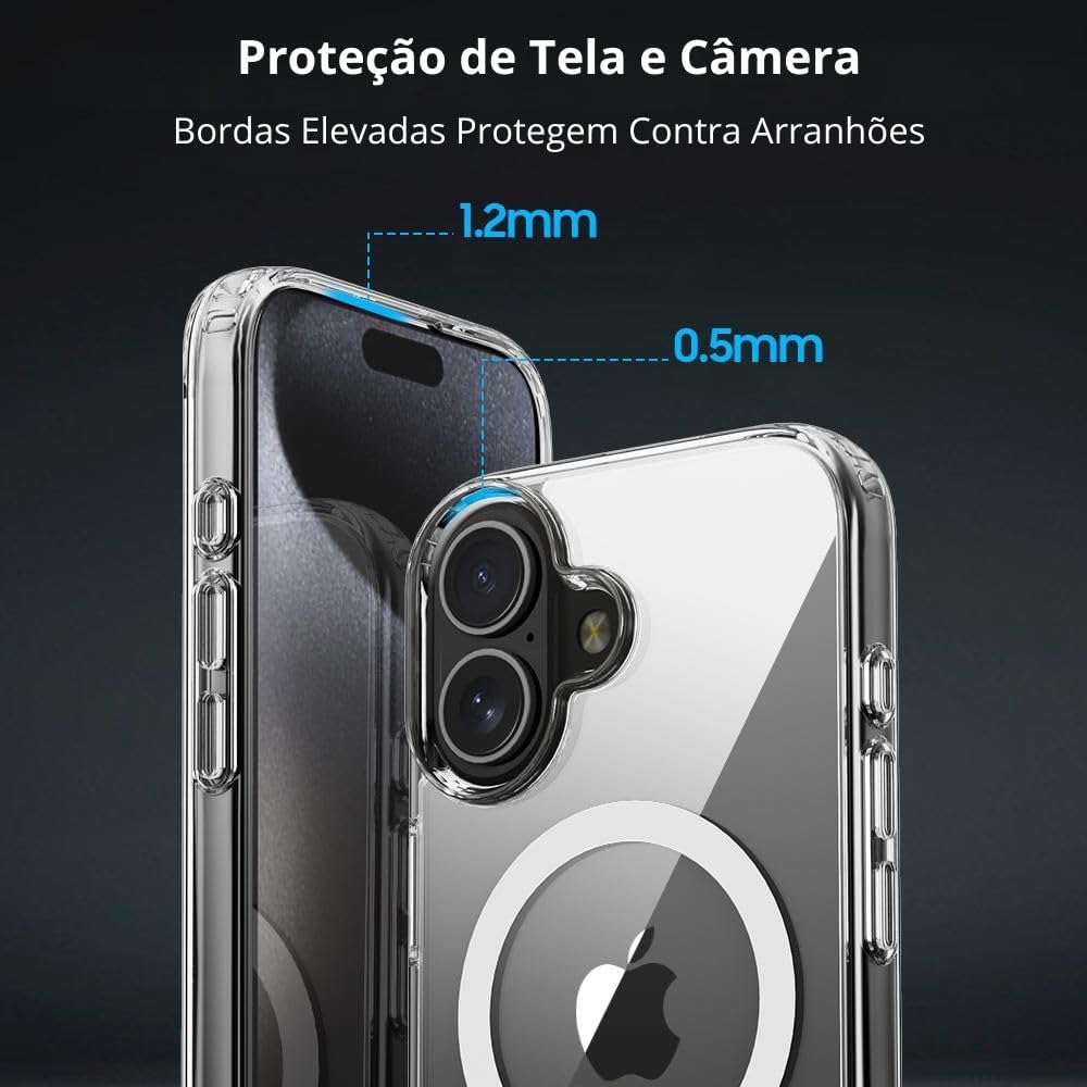 Recursos que oferecem proteção, beleza e praticidade Compatível com Mag-Safe para carregamento e acessórios magnéticos Proteção de nível militar com cantos reforçados Air Guard Material premium com tecnologia anti-amarelamento duradoura Bordas elevadas que protegem câmera e tela contra quedas e riscos Design elegante, fino e totalmente transparente para valorizar seu iPhone