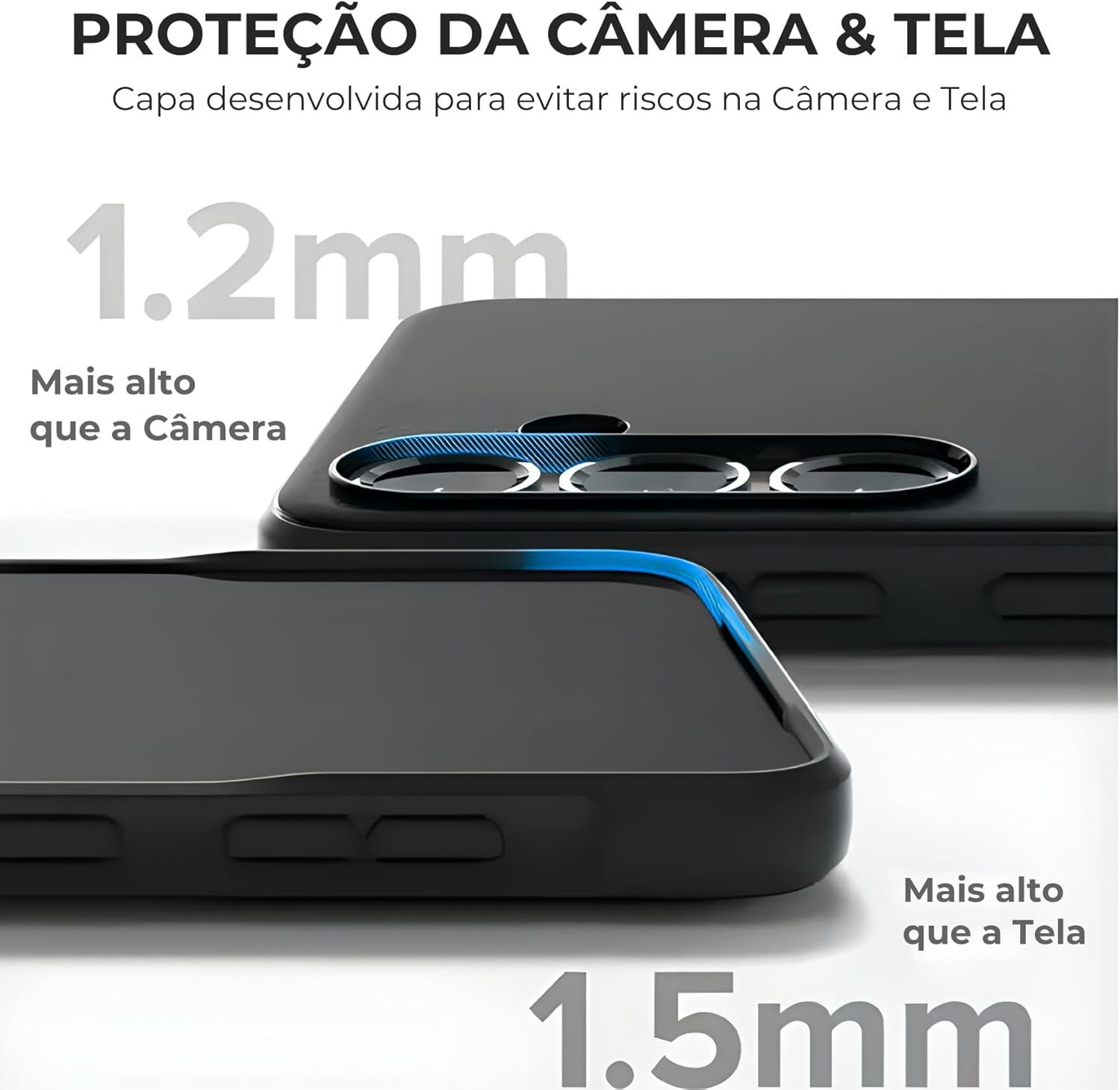 Proteção Avançada para Câmera e Tela: Bordas elevadas protegem lentes e display contra arranhões e impactos do dia a dia.