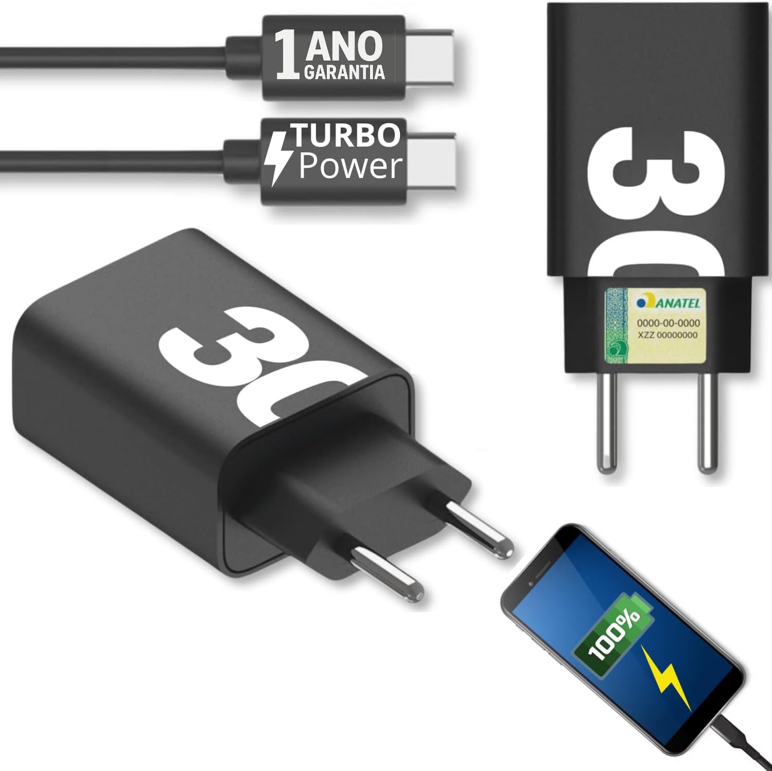 ‎Bivolt (110/220V), Cabo 1 metro Tipo-C, muito mais rápdio, Carregador Turbo 30W, Funciona com Todos os modelos Tipo-C, Segurança e Qualidade