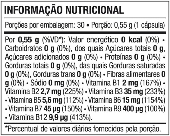 Fórmula completa de vitaminas do complexo ‘B’ com oito vitaminas, contribui para o metabolismo energético e do ferro, auxiliando também no funcionamento do sistema imune.