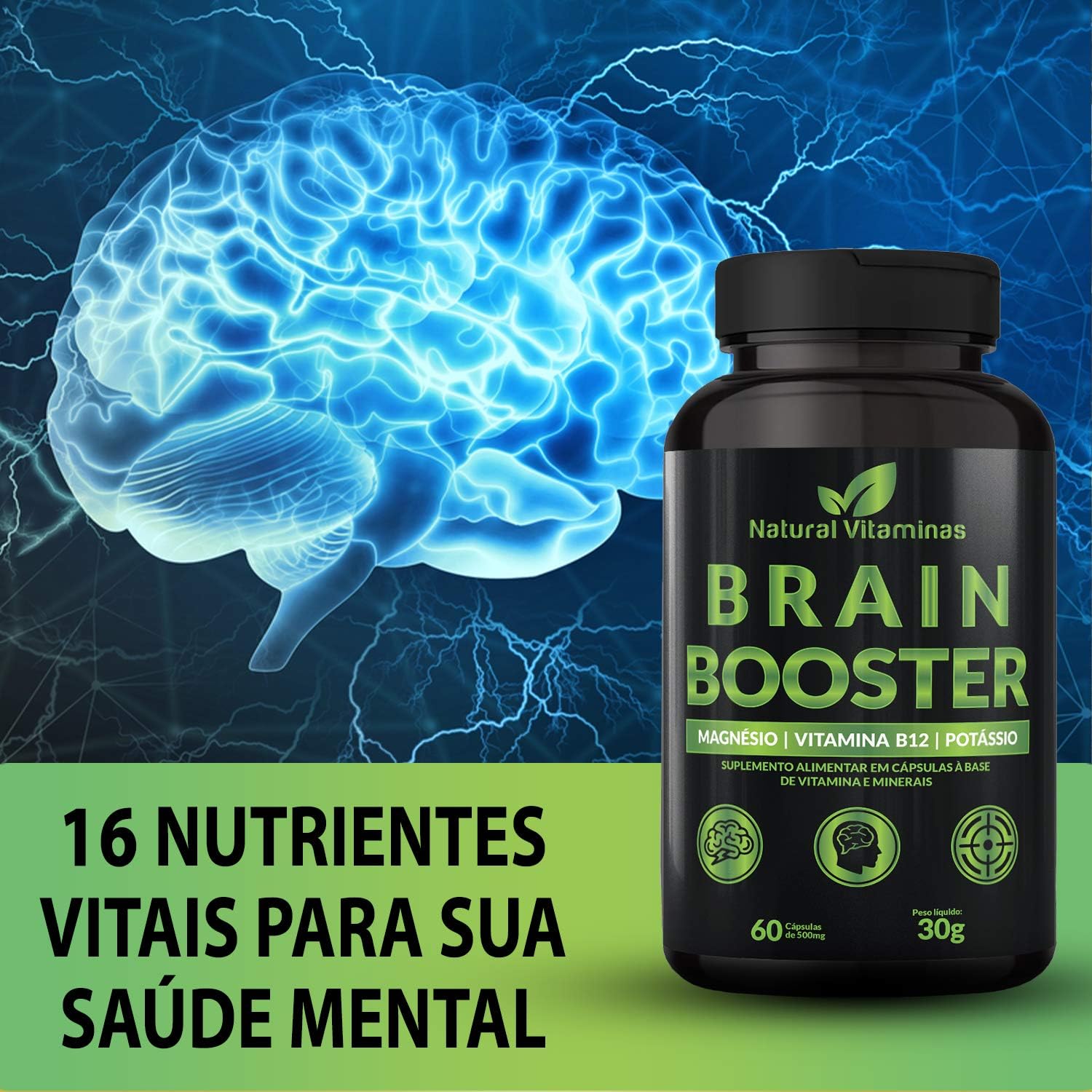 O Brain Booster é composto por um grupo de vitaminas, incluindo a vitamina B1, vitamina B2, vitamina B3, vitamina B5, vitamina B6, vitamina B12, biotina, magnesio, potassio, selenio, e zinco.