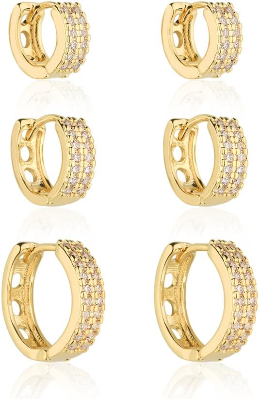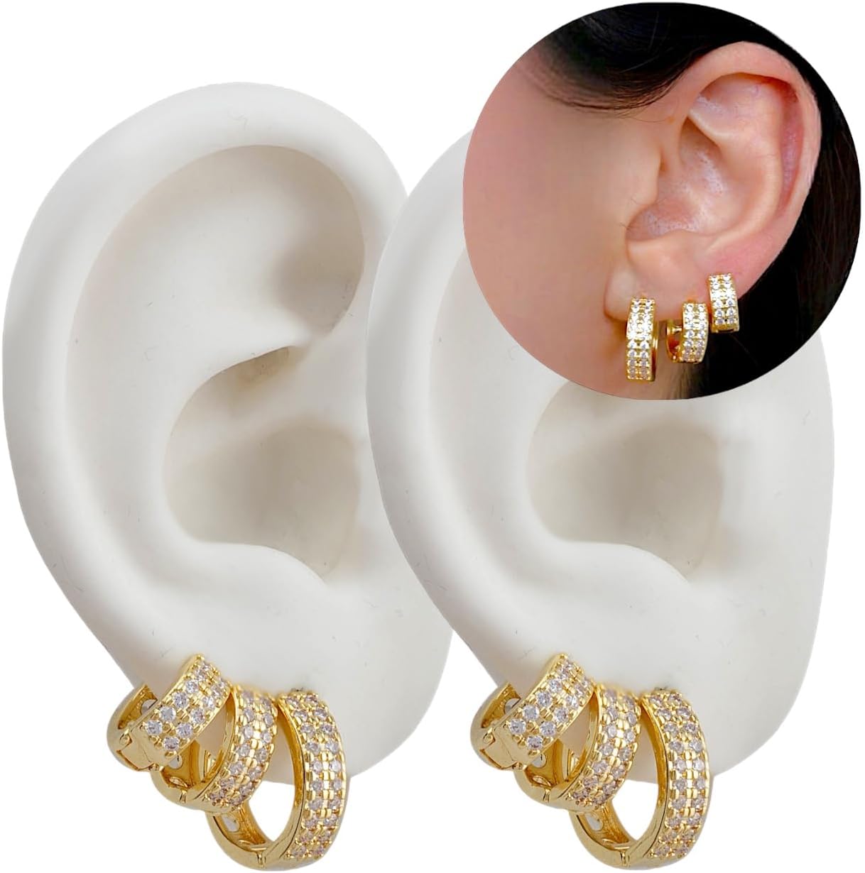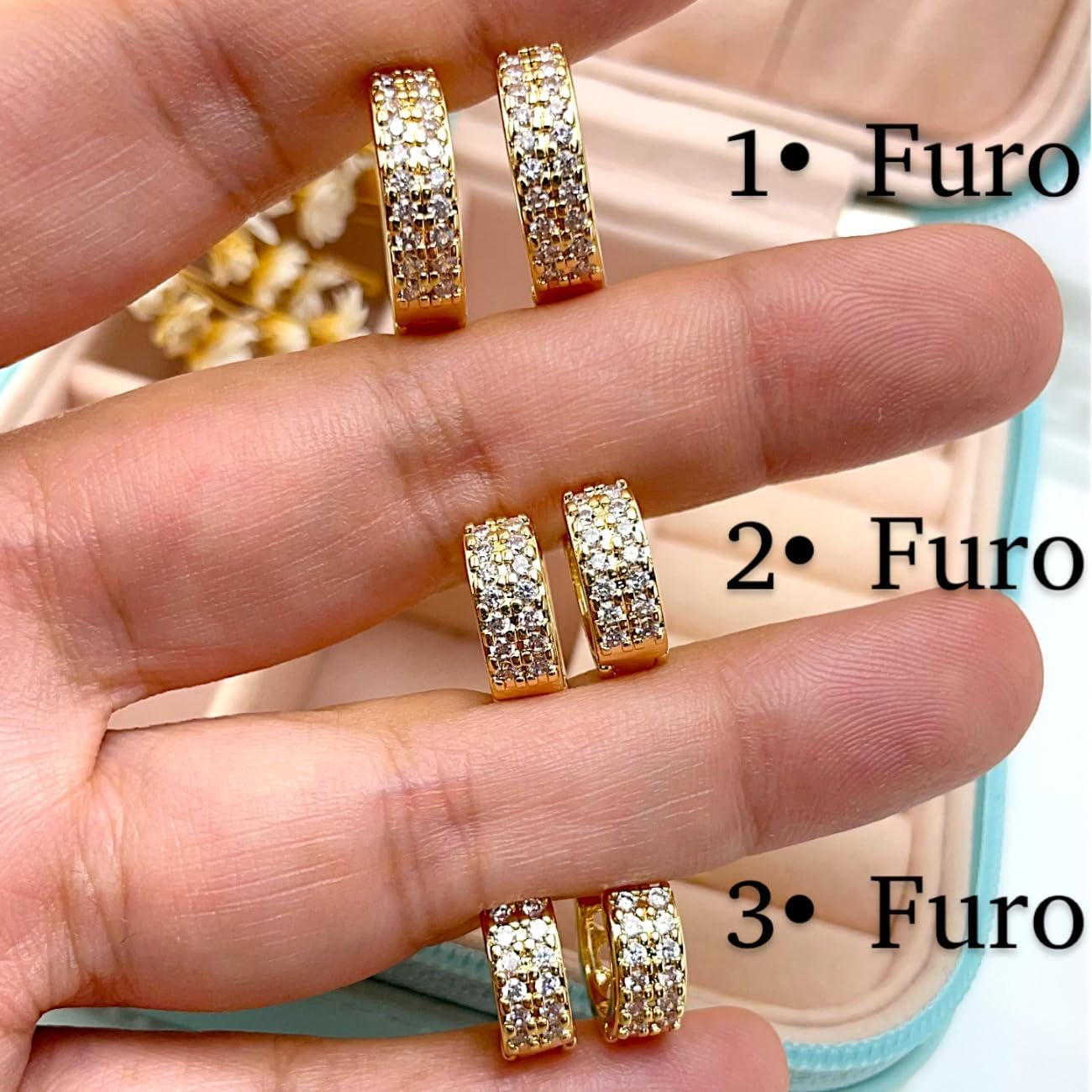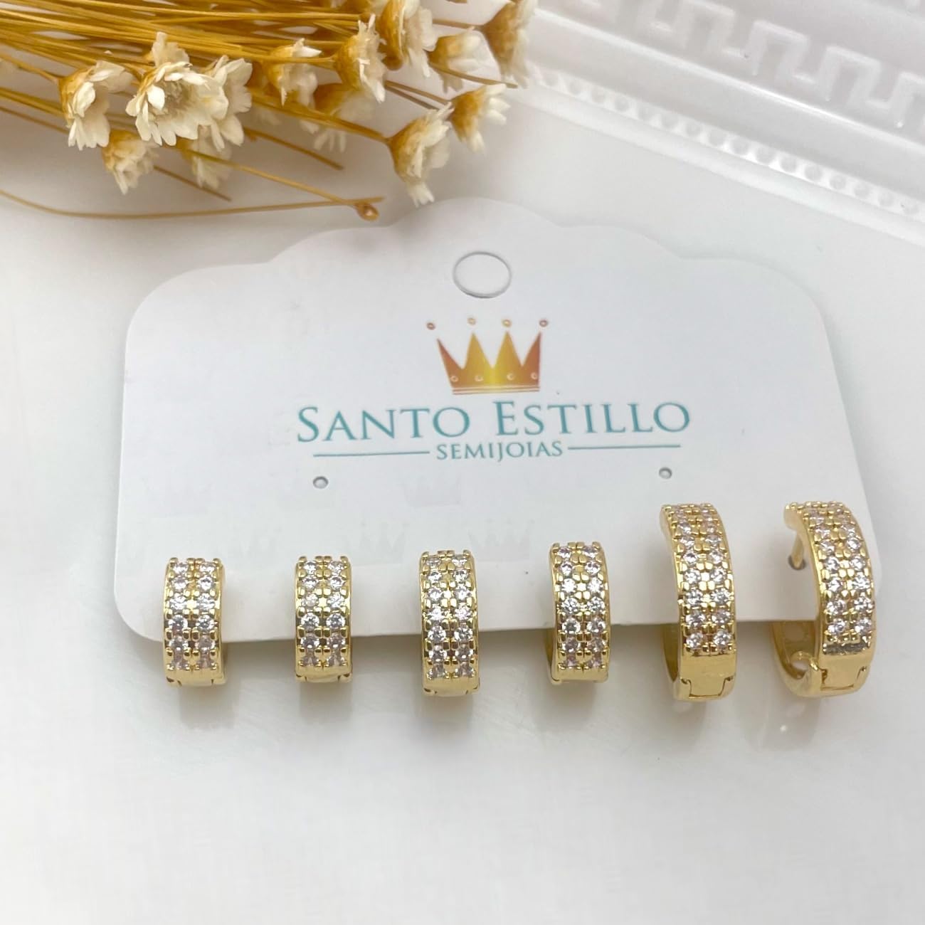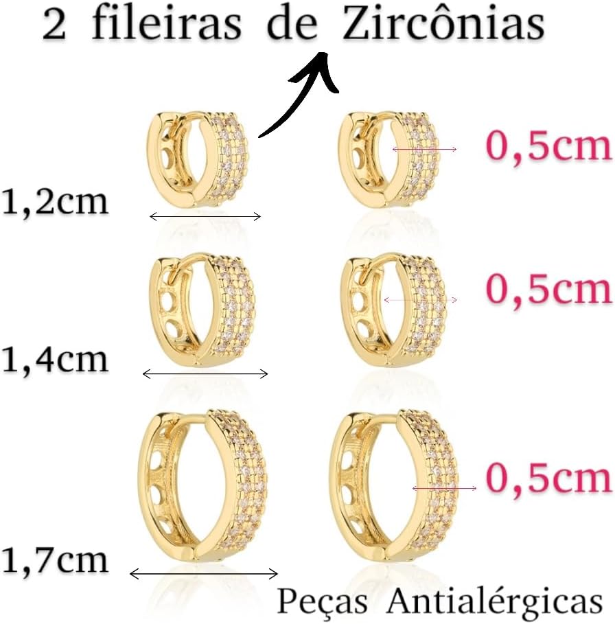 Conjunto de Brinco Feminino Argola Argolinha 3 Furos Semijoia Folheado Banhado a Ouro 18k Banho paládio antialérgico Cravejado Pedra Zircônia Festa Casual Moda Estilo Mulher Kit