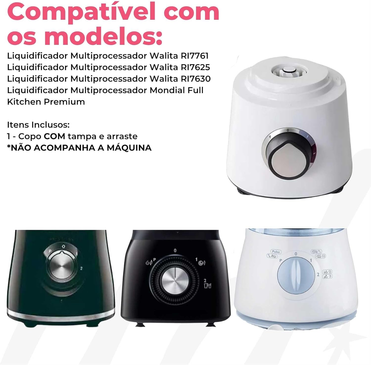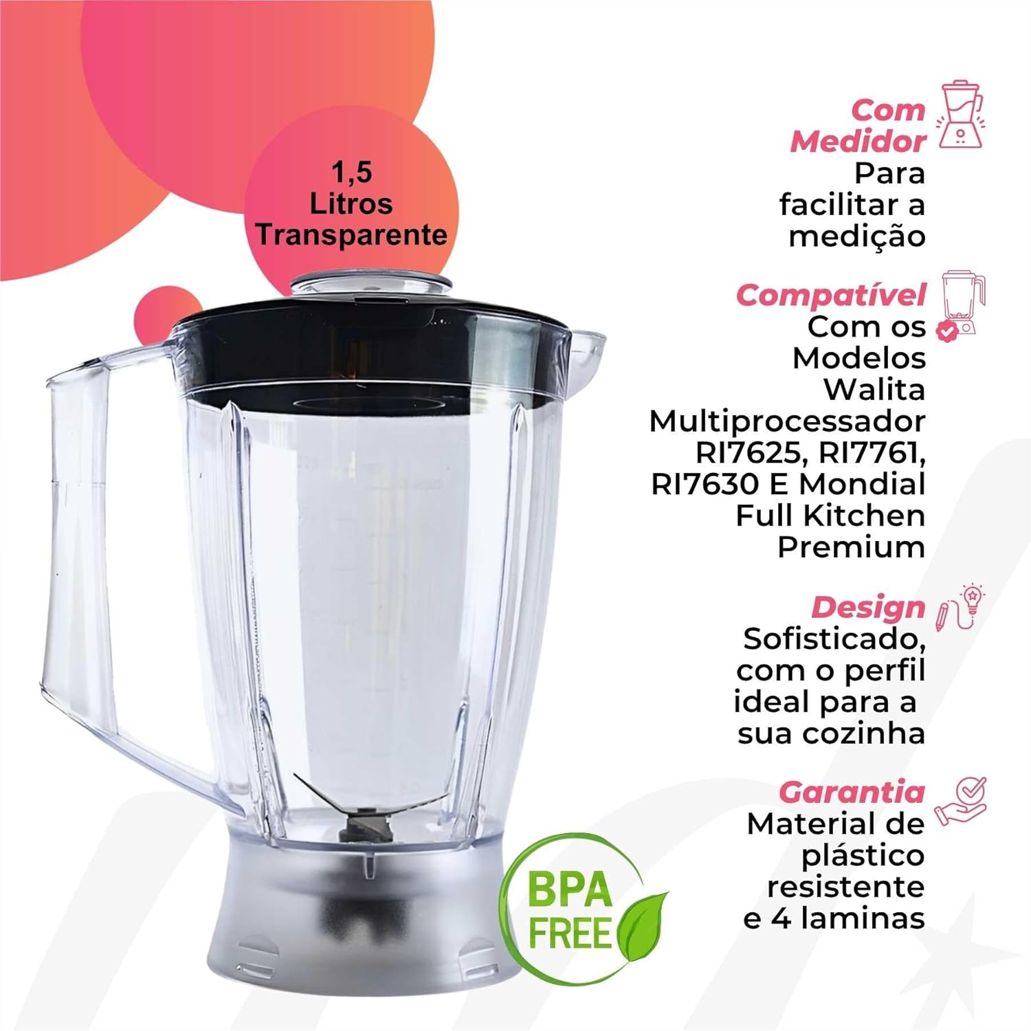 ⦁ O Copo De Liquidificador foi projetado especificamente para otimizar as funcionalidades dos Modelos Walita Multiprocessador RI7625, RI7761, RI7630 e Mondial Full Kitchen Premium;