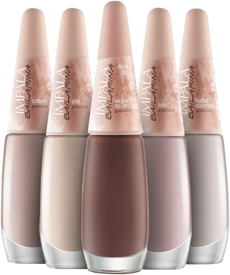 Além de suas coleções regulares de estação, como primavera/verão e outono/inverno, a Impala está sempre surpreendendo suas consumidoras com novidades. Desta vez, a menina dos olhos que chega nas lojas é a coleção Bailarina. O nude, cor tendência para o outono e sempre presente em composições de moda mundo afora foi escolhida como a base desta inter-coleção. Inspirada neste universo do ballet, a coleção traz quatro tons de nude para agradar todos os gostos. Os esmaltes são dermatologicamente testados, possuem ótima cobertura, durabilidade, secagem rápida e alto brilho. Possuem pincel flat, que facilita a aplicação e proporciona uma cobertura completamente uniforme Impala Esmalte Cremoso Ballet Clássico nude com fundo acinzentado; Impala Esmalte Cremoso Collant nude com fundo amarronzado, excelente pigmentação; Impala Esmalte Cremoso Plié nude claro com micro partículas de brilho; Impala Esmalte Cremoso Ponta do Pé nude com fundo rosa escuro; Impala Esmalte Cremoso Tutu nude com fundo rosado.