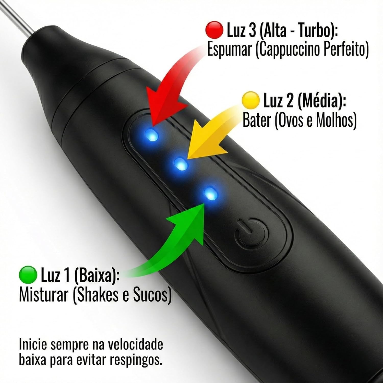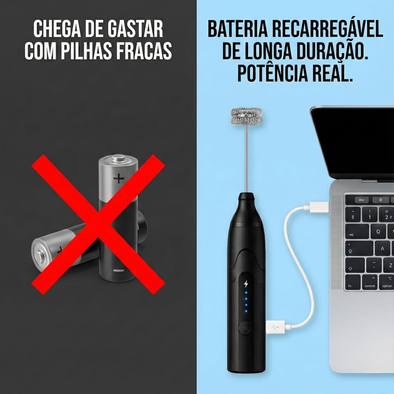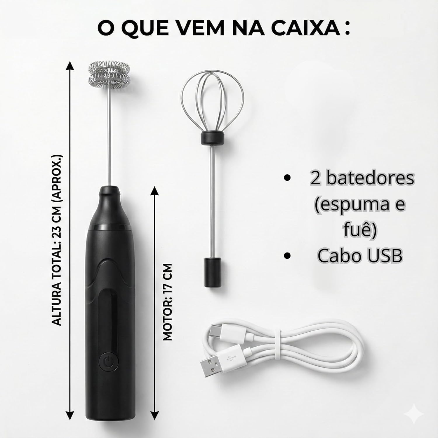 Recarregável por USB; 3 velocidades; 2 em 1 (espumador + fuê); Hastes removíveis; Aço inox |