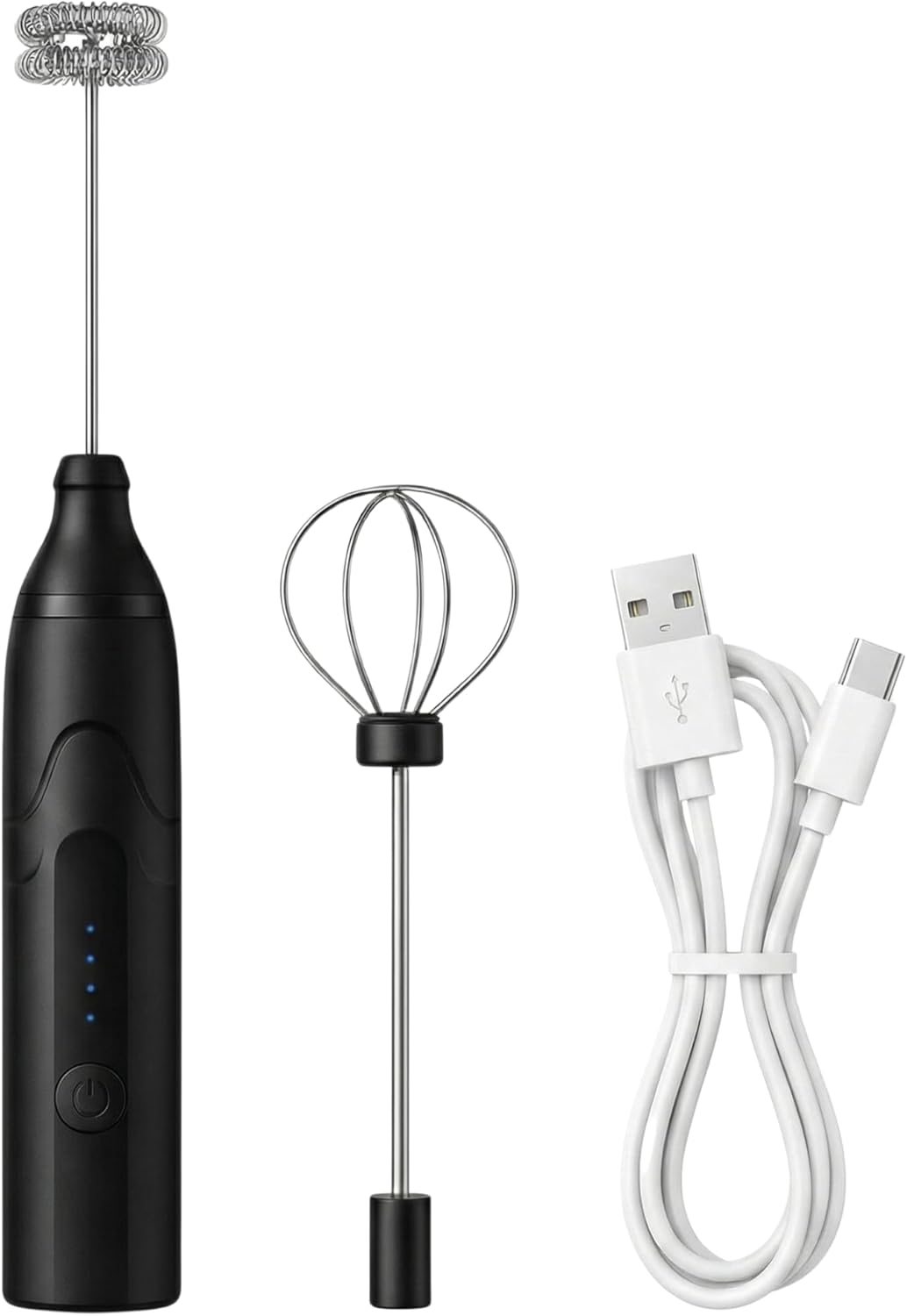 Espumador de Leite Elétrico e Mixer Portátil USB Recarregável – 3 Velocidades Potentes com 2 Cabeças (Mola e Fouet) – Batedor em Inox para Café, Cappuccino, Shakes e Ovos