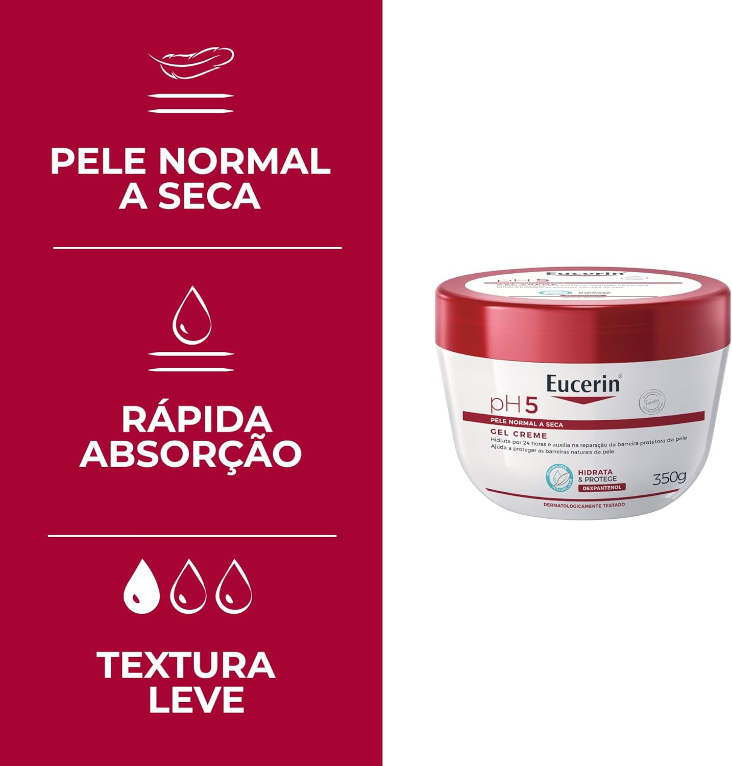 Eucerin pH5 Gel Creme Corporal oferece hidratação por 24 horas e proteção da barreira da pele. Desenvolvido com Dexpantenol e a tecnologia pH5 Balance System, sua textura é leve e não deixa resíduos. Ideal para hidratação diária de pele normal a seca.