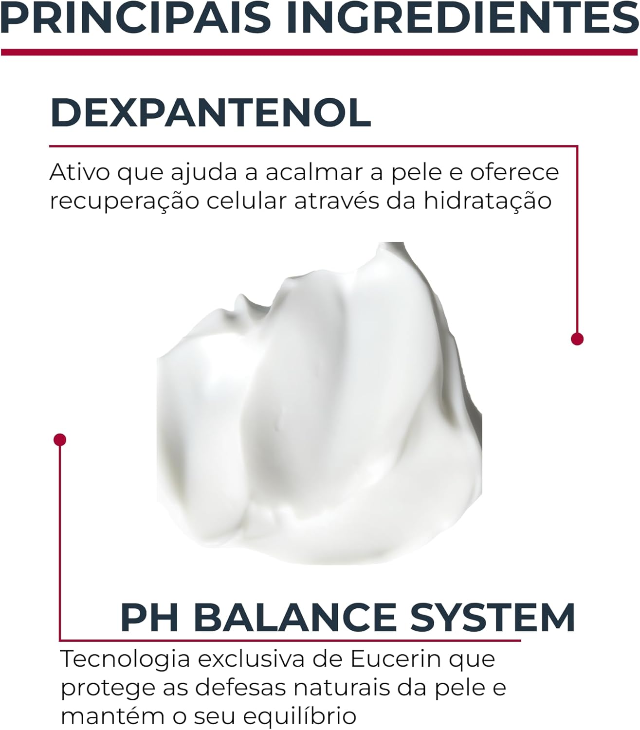 Aplique o hidratante creme corporal generosamente por todo o corpo massageando suavemente e espere até a completa absorção do produto. Indicado uso combinado com Eucerin pH5 Gel de Limpeza.