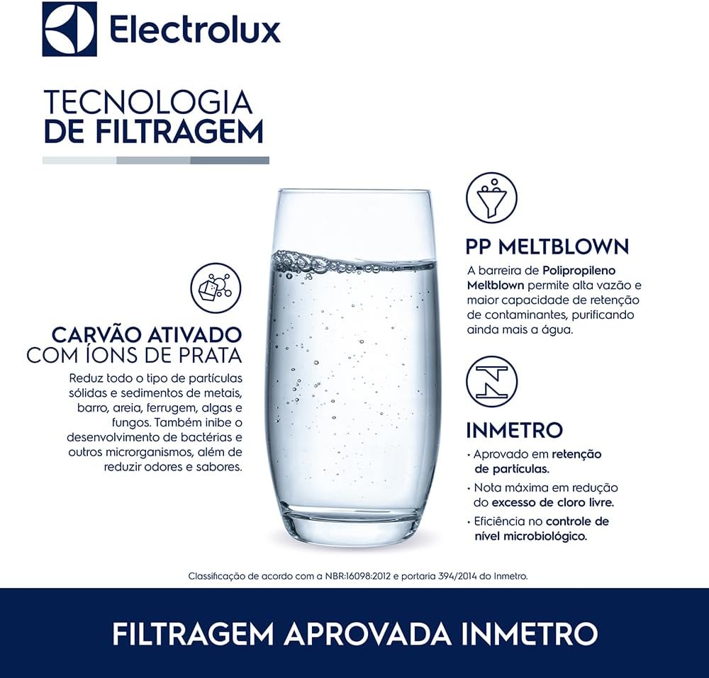 O Refil Original Electrolux garante água pura e preserva a sua saúde. Com tecnologia de filtragem avançada e aprovada pelo Inmetro, oferece eficiência comprovada na retenção de partículas, controle microbiológico e redução de cloro livre.