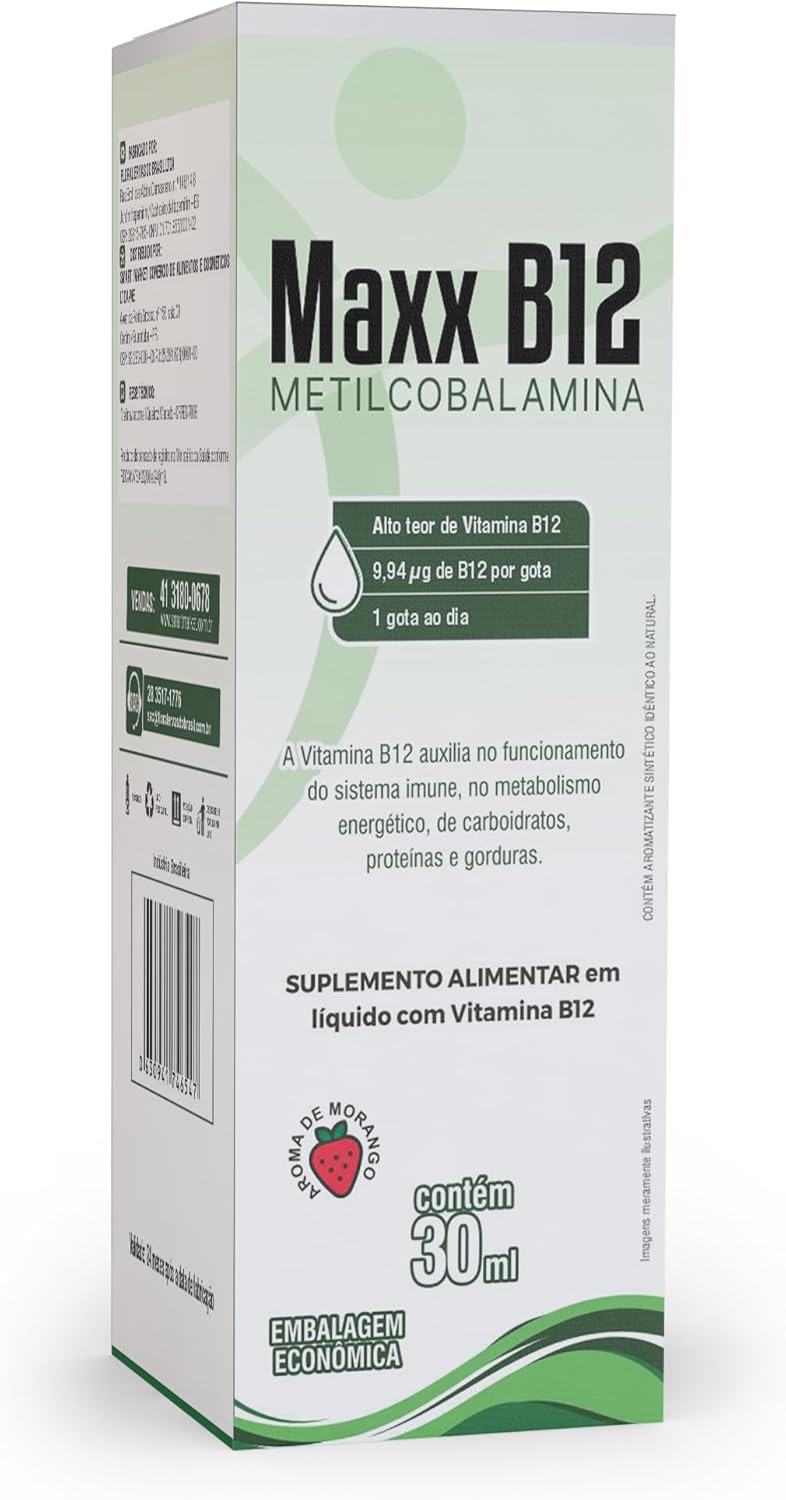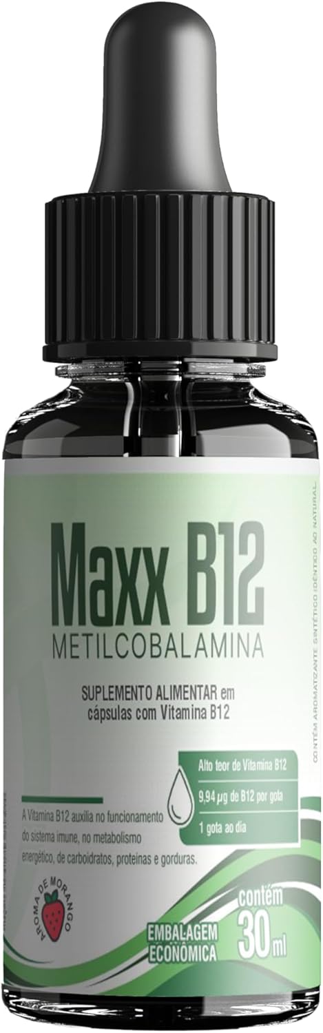 Maxx B12. A Vitamina B12 na sua melhor forma “METILCOBALAMINA”, com dose máxima diária autorizada pela ANVISA por gota.Frasos com 30ml.Sabor morango.