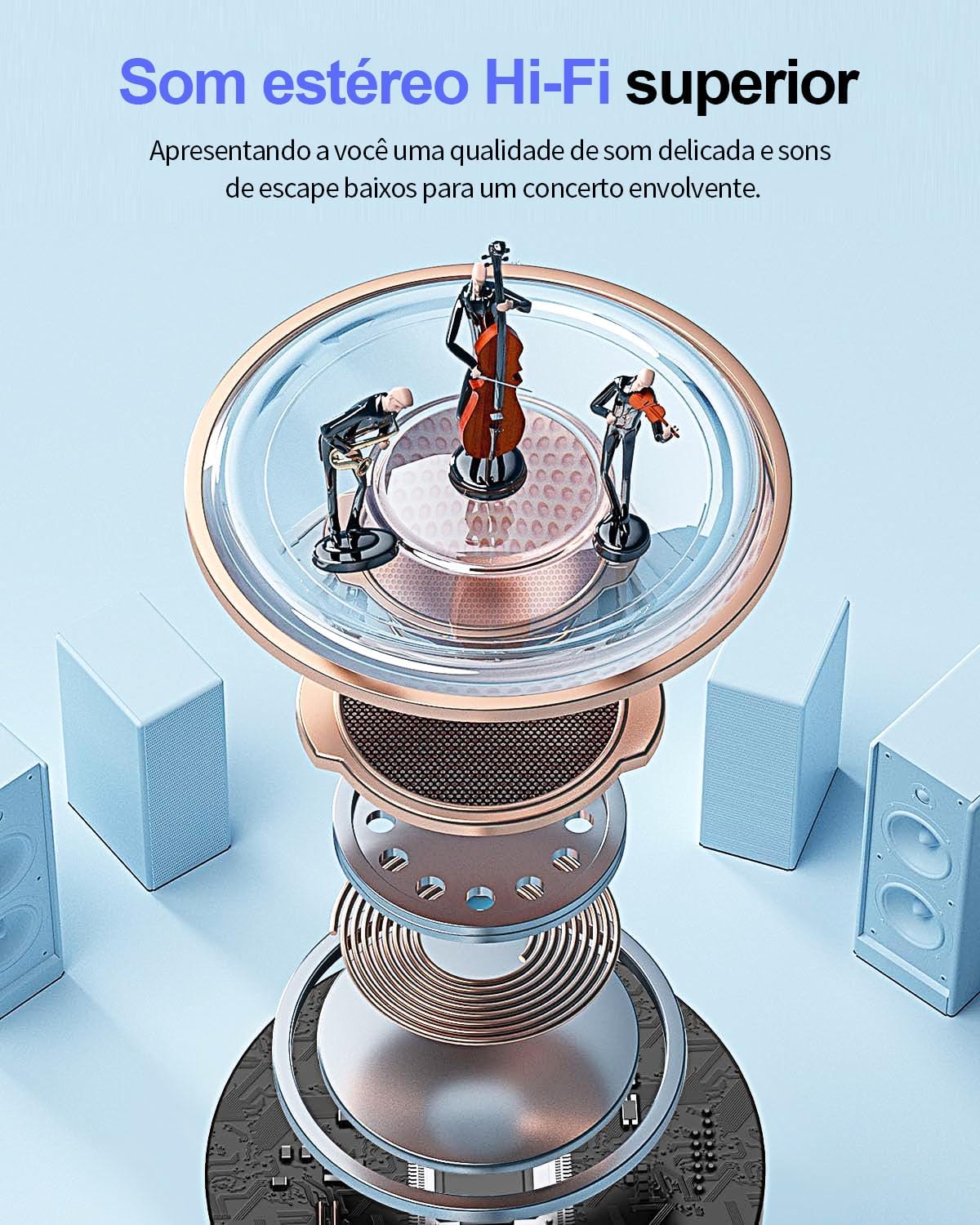 Evite usar por longos períodos: Usar fones de ouvido Bluetooth por longos períodos pode causar desconforto nos ouvidos, especialmente em ambientes de alta temperatura. Descanse adequadamente para relaxar os ouvidos.