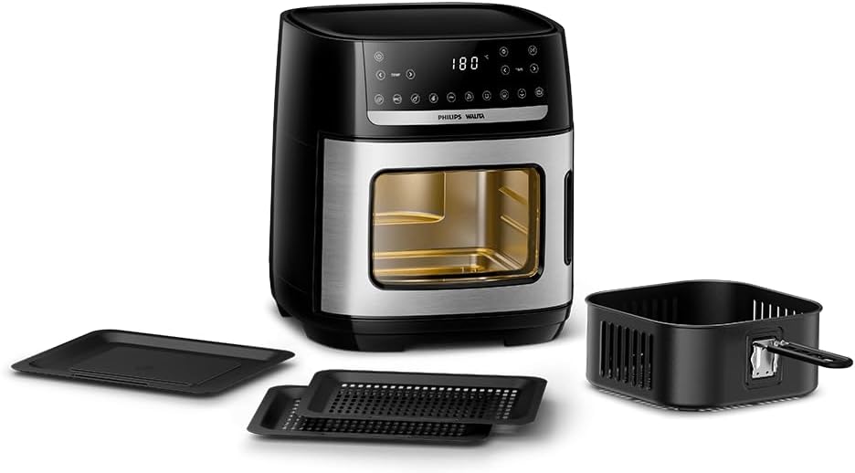 Airfryer Forno Série 5000, 1600W, com uma capacidade de 12 litros, ideal para preparar refeições para toda a família. Conta com 9 funções predefinidas, incluindo Desidratação e Preparo de Iogurte, oferecendo versatilidade na cozinha. Inclui 4 acessórios antiaderentes: 2 grelhas, 1 coletor de gordura, 1 cesto de airfryer com pegador removível e uma conveniente janela transparente para acompanhar o preparo das receitas com facilidade. Fácil de lavar: Acessórios removíveis e antiaderentes, preparados para a máquina de lavar. Inspire-se com + de 500 receitas no App HomeID