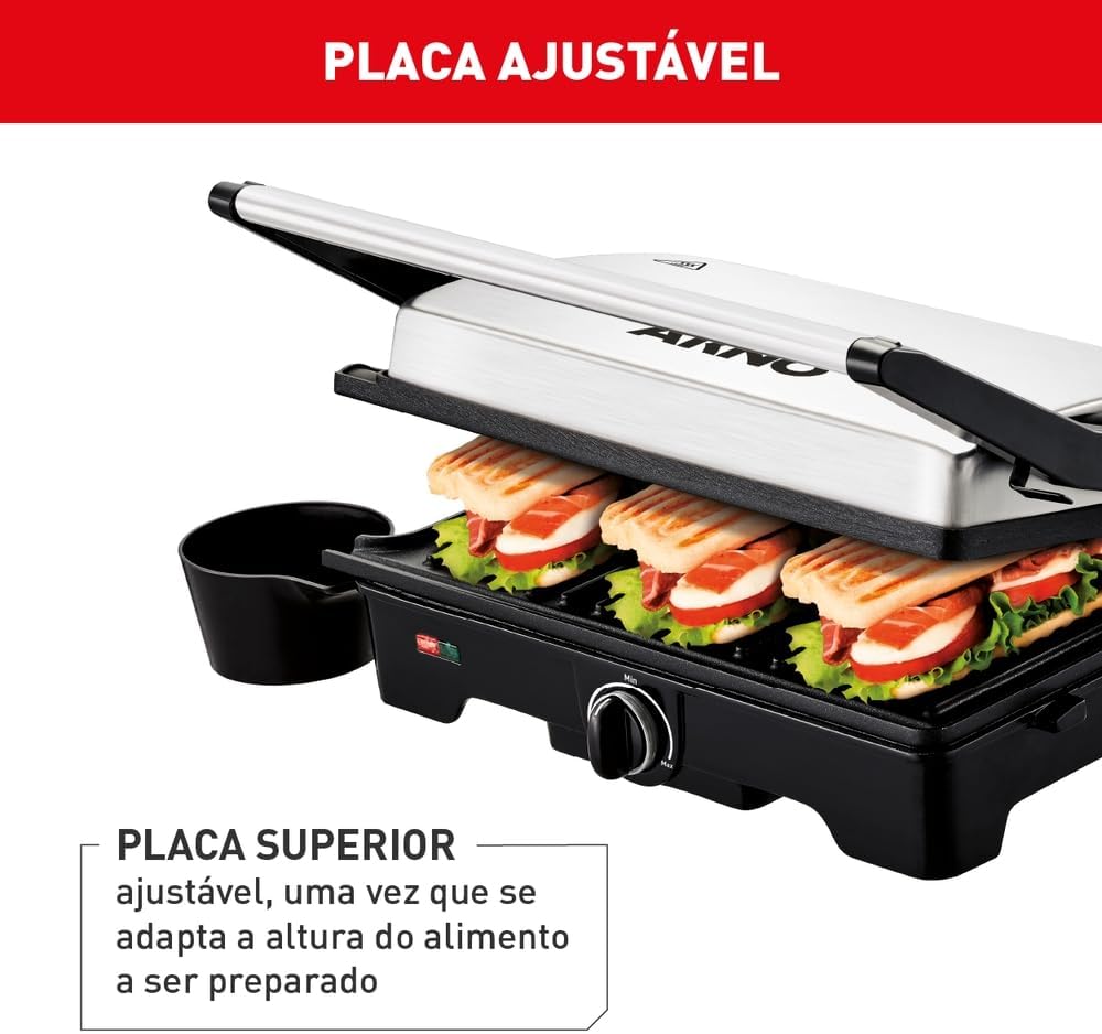 Placas antiaderentes e ajustáveis: as placas com revestimento antiaderente evitam que os alimentos grudem, garantindo fácil limpeza. A parte superior se ajusta à altura dos alimentos, proporcionando grelhados uniformes e precisos.
