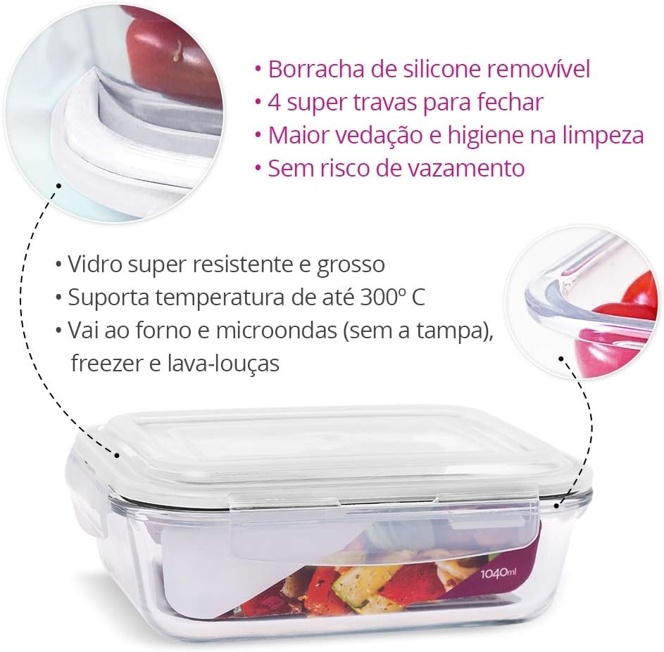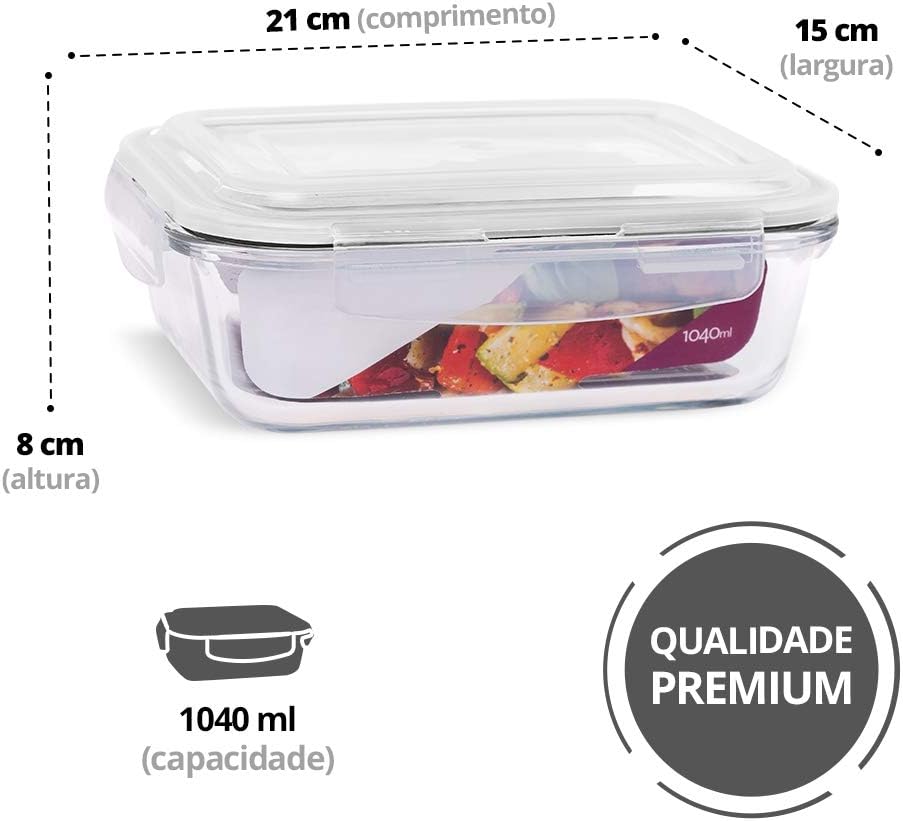 KIT 4 Potes de Vidro Retangular Tampa Hermética 1040ml KIT 4 Potes de Vidro Retangular Tampa Hermética com Divisória 1040ml Querendo trocar seus Potes de plástico por um pote de vidro com alta qualidade, resistência, durabilidade e fácil de limpar? Então me acompanhe nessa leitura e surpreenda-se com os Potes de Vidro Hermético: Existem muitos malefícios que podem ser causados devido ao uso do plástico para preservar os seus alimentos. Sabia que quando aquecido, ele pode liberar toxinas sobre a sua comida? Isso pode causar doenças graves com o passar do tempo. Sem falar nas manchas de alimentos que ficam no pote de plástico, não é mesmo? Com os Potes de Vidro Hermético, você não estará sujeito à isso. Além de serem muito resistentes, eles também suportam a variação de temperaturas em até 300ºC, podendo ir ao freezer e micro-ondas. São muito fáceis de serem lavados, pois possuem o anel de silicone para vedação removível, não deixa o cheiro se espalhar e sem qualquer risco de vazamento, mantém o pote super vedado! A nossa equipe é especializada em identificar produtos que aliam qualidade, preço acessível e que de fato, resolvam algum problema. São muitos anos comercializando produtos para sua casa, sabemos como atender suas necessidades com muita dedicação e amor pelo trabalho. =) Aliando qualidade, praticidade e preço justo, apresentamos o Pote de Vidro Hermético. O Pote ideal para o seu dia-a-dia. Diferenciais — Anel de silicone removível Possui 4 super travas Mantém os alimentos frescos por mais tempo Suporta uma variação térmica de até 300°C (não é indicado dar choque térmico) Evita que o cheiro se espalhe devido a sua super vedação Vai ao forno convencional (sem a tampa), forno elétrico (sem a tampa), microondas (sem