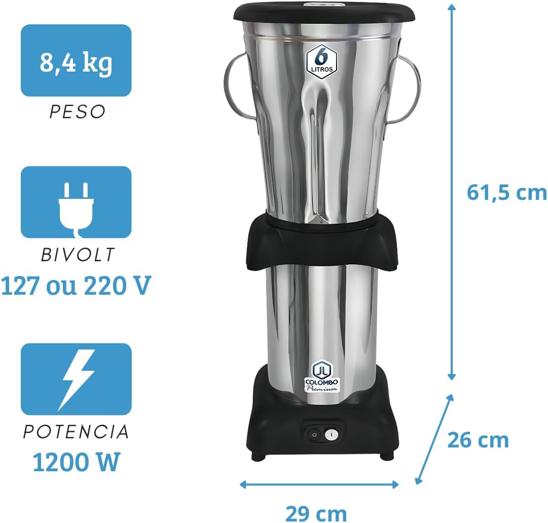 Liquidificador 6 Litros BR – Copo em Aço Inox O Liquidificador é ideal para preparar diversos tipos de alimentos, como vitaminas, molhos, sopas cremosas e muito mais. Com lâminas ultra afiadas e resistentes. Capacidade de 6 litros.Fabricante: Metalurgica JL ColomboEspecificaçðes: Tipo: Baixa Rotação Uso: Com./Ind. Corpo/Copo: Aço Inox. Rotação: 3500 rpm Frequência: 60 Hz Isolação: Classe F Peso: 10,800kg Tensão: 127v/220v (Bivolt) Potência: 1200W 1000W