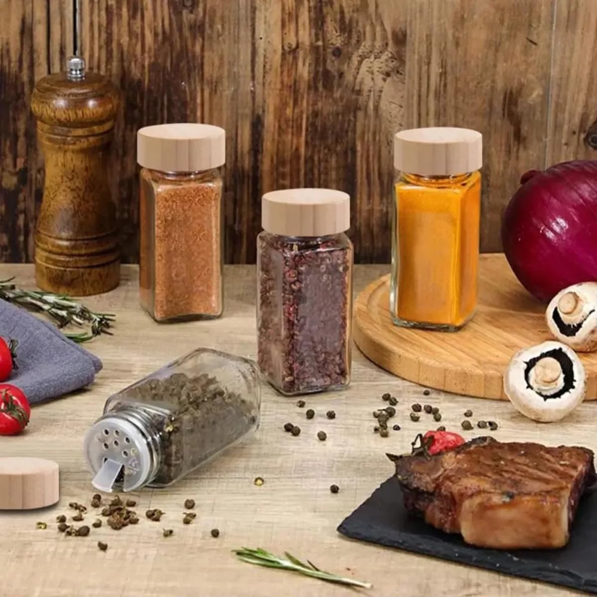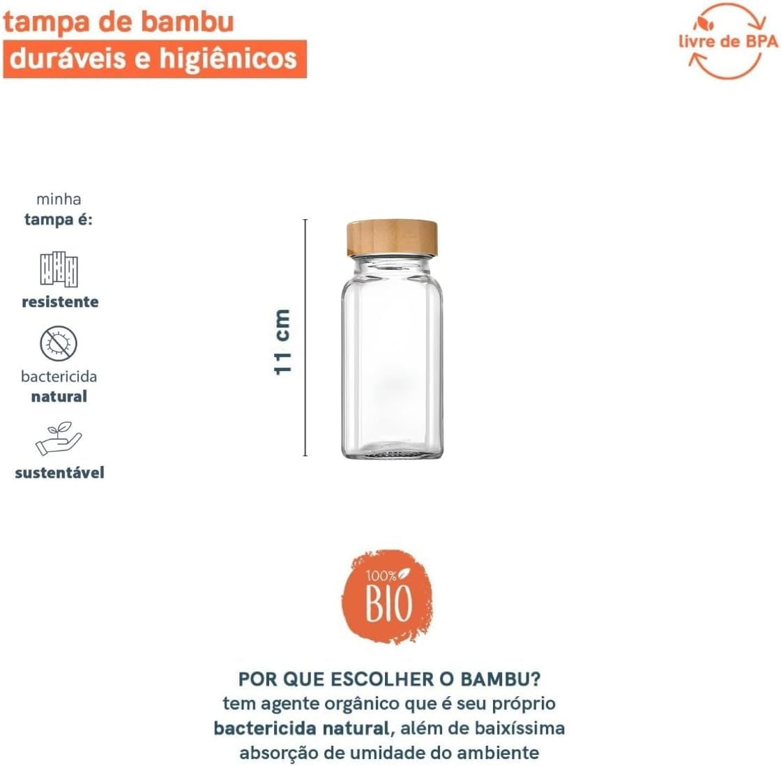 Kit com 12 potes de vidro de alta resistência – Capacidade individual: 120 ml (cada pote) – Altura: 11 cm – Tampa de bambu natural com vedação interna de silicone – Tampa interna com dosador perfurado, ideal para temperos finos e grossos – Livre de BPA e totalmente seguro para uso alimentar – Mantém os temperos secos e conservados por mais tempo – Evita entrada de ar e umidade – Visual moderno e minimalista – Material ecológico, resistente e sustentável – Ideal para organização de prateleiras e gavetas – Permite identificar facilmente o conteúdo sem abrir o pote – Tampa de bambu com bactericida natural – Sustentável e livre de produtos tóxicos