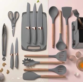Kit 19 Utensílios De Cozinha Com Cabo De Madeira E Silicone (Cinza)