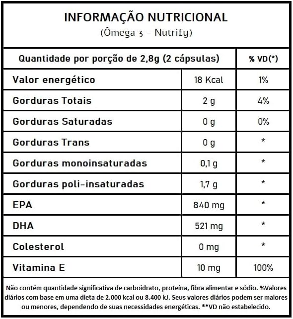 Kit 3 Ômega 3 TG Ultra Nutrify 120 Cápsulas Os benefícios do Ômega 3 são respaldados em ampla literatura científica. O Omega 3 Nutrify oferta o nutriente em sua forma de triglicerídeos (TG), a mais biodisponível, com 840 mg de EPA e 521 mg de DHA. O óleo de peixe utilizado em sua produção é certificado pelo IFOS (International Fish Oil Standards Program), em virtude de sua qualidade, pureza e segurança. NUTRIFY valoriza a origem de cada ingrediente, respeita a integridade de suas fontes naturais e dos envolvidos em sua produção. É assim que criamos produtos saudáveis e saborosos, que fazem bem para as pessoas e para o planeta. INGREDIENTES: Óleo de peixe, DL alfatocoferol (vitamina E), cápsula: água purificada, gelificante gelatina e umectante glicerina. NÃO CONTÉM GLÚTEN. ALÉRGICOS: CONTÉM DERIVADOS DE PEIXE. PESSOAS ALÉRGICAS A PEIXES E CRUSTÁCEOS DEVEM EVITAR O CONSUMO DESTE PRODUTO. ESTE PRODUTO NÃO É UM MEDICAMENTO. NÃO EXCEDER A RECOMENDAÇÃO DIÁRIA DE CONSUMO INDICADA NA EMBALAGEM. MANTENHA FORA DO ALCANCE DE CRIANÇAS. ESTE PRODUTO É RECOMENDADO PARA ADULTOS A PARTIR DE 19 ANOS.