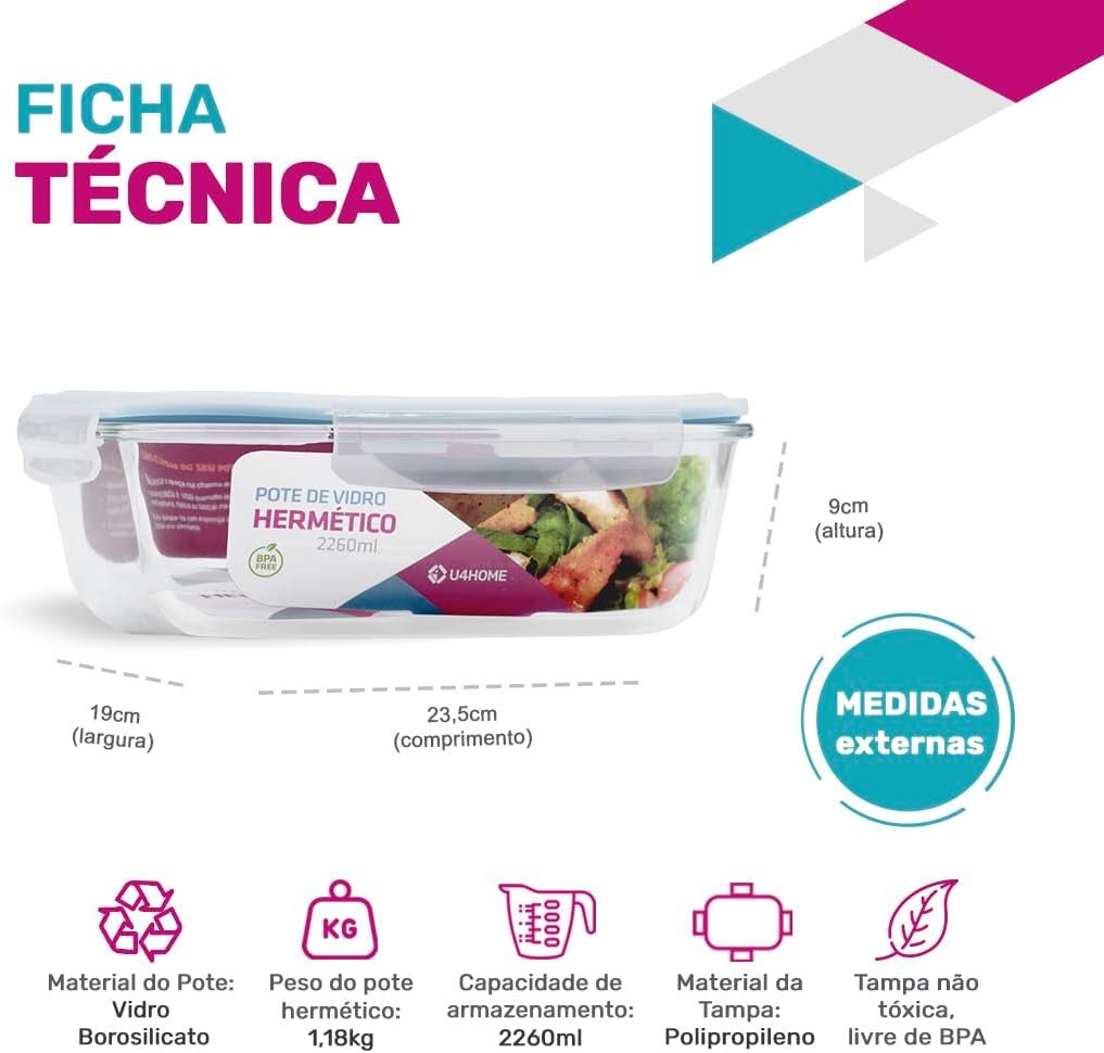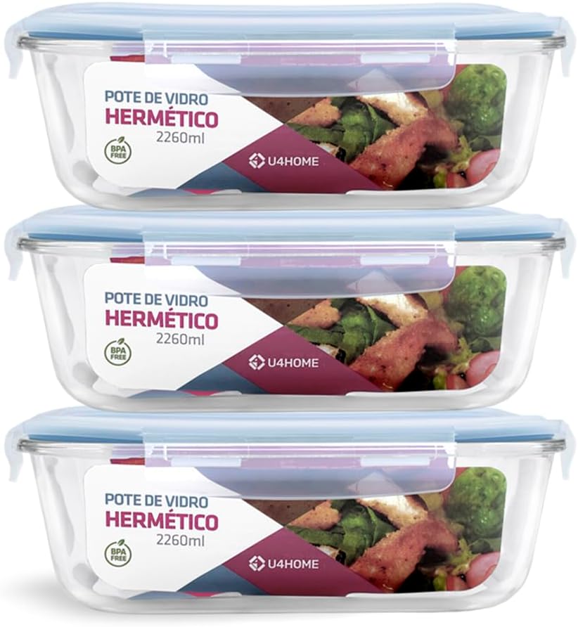 3un do Pote Hermético de Vidro Retangular 2260ml Querendo trocar seus Potes de plástico por um pote de vidro com alta qualidade, resistência, durabilidade e fácil de limpar? Então me acompanhe nessa leitura e surpreenda-se com os Potes de Vidro Hermético U4HOME: Existem muitos malefícios que podem ser causados devido ao uso do plástico para preservar os seus alimentos. Sabia que quando aquecido, ele pode liberar toxinas sobre a sua comida? Isso pode causar doenças graves com o passar do tempo. Sem falar nas manchas de alimentos que ficam no pote de plástico, não é mesmo? Com os Potes de Vidro Hermético, você não estará sujeito à isso. Além de serem muito resistentes, eles também suportam a variação de temperaturas em até 300ºC, podendo ir ao freezer e micro-ondas. São muito fáceis de serem lavados, pois possuem o anel de silicone para vedação removível, não deixa o cheiro se espalhar e sem qualquer risco de vazamento, mantém o pote super vedado! O Pote Hermético de 2260ml possui o tamanho ideal para preparar e transportar marmitas. O seu tamanho e design permitem o armazenamento seguro dos alimentos seja no freezer ou geladeira. A nossa equipe é especializada em identificar produtos que aliam qualidade, preço acessível e que de fato, resolvam algum problema. São muitos anos comercializando produtos para sua casa, sabemos como atender suas necessidades com muita dedicação e amor pelo trabalho. =) Aliando qualidade, praticidade e preço justo, apresentamos o Pote de Vidro Hermético. O Pote ideal para o seu dia-a-dia. Diferenciais — Anel de silicone removível Possui 4 super travas Mantém os alimentos frescos por mais tempo Suporta uma variação térmica de até 300°C (não é indicado dar choque térmico) Evita que o cheiro se espalhe devido a sua super vedação Vai ao forno convencional (sem a tampa), forno elétrico (sem a tampa), microondas (sem a tampa) e freezer Tampa livre de BPA (Bisfenol A), ou seja, não é tóxica Fácil de limpar e higienizar, pois pode tirar o anel de silicone e vedação para limpeza Sem risco de vazamento devido a sua super vedação Super resistente, Vidro Borosilicato Fique atento a imitações baratas, só os potes U4HOME aliam qualidade com todos os diferenciais mencionados. Ideal para: — Preparar e transportar marmitas; Armazenar os alimentos na geladeira; Marinar carnes e peixes Aquecer os alimentos no micro-ondas Guardar os alimentos no freezer Presentear a mãe ou a sogra…rs Ficha Técnica — Modelo: Pote de Vidro Redondo Marca: Nabox Material: Vidro Borosilicato, tampa de plástico e anel vedação de silicone Capacidade: 2260ml Tamanho: 24,6 x 19,6 x 7,7cm Peso: 3,54Kg Item incluso: 3 Pote Hermético Garantia: 30 dias contra defeito de fabricação