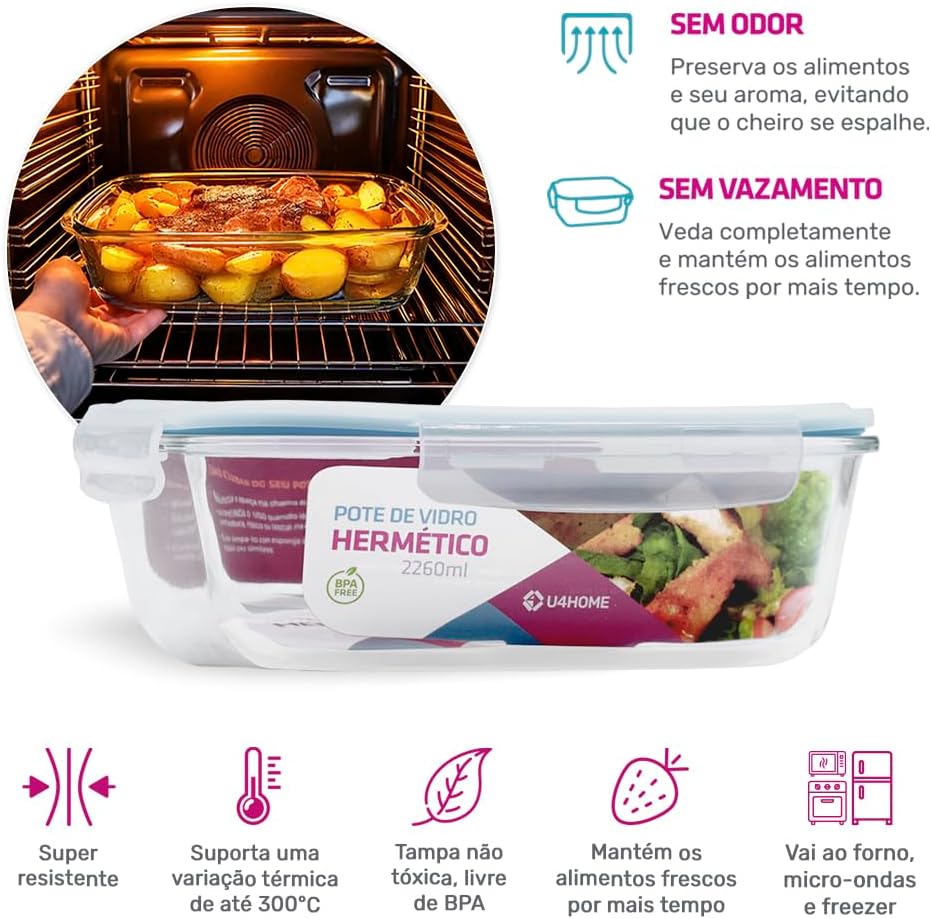 Pote De Vidro Grande Tamanho 2260ml Com Tampa Plástica Hermética 4 Travas Livre De BPA Lasanha Assar