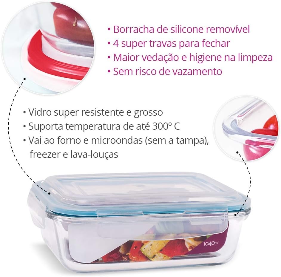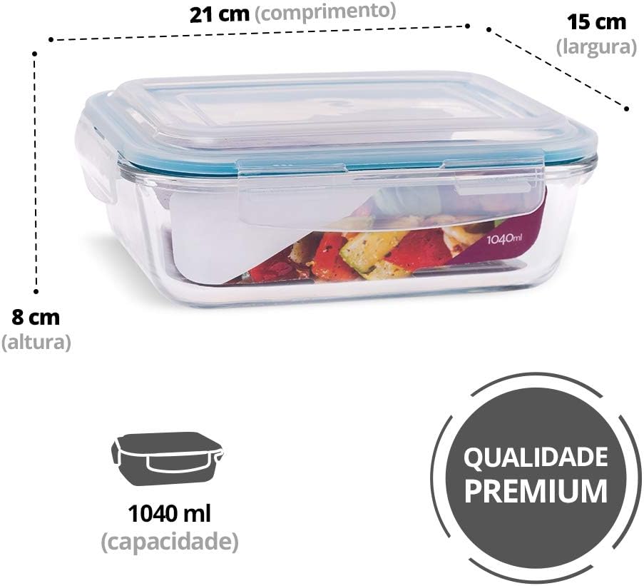 KIT 4 Potes de Vidro Retangular Tampa Hermética 1040ml KIT 4 Potes de Vidro Retangular Tampa Hermética com Divisória 1040ml Querendo trocar seus Potes de plástico por um pote de vidro com alta qualidade, resistência, durabilidade e fácil de limpar? Então me acompanhe nessa leitura e surpreenda-se com os Potes de Vidro Hermético: Existem muitos malefícios que podem ser causados devido ao uso do plástico para preservar os seus alimentos. Sabia que quando aquecido, ele pode liberar toxinas sobre a sua comida? Isso pode causar doenças graves com o passar do tempo. Sem falar nas manchas de alimentos que ficam no pote de plástico, não é mesmo? Com os Potes de Vidro Hermético, você não estará sujeito à isso. Além de serem muito resistentes, eles também suportam a variação de temperaturas em até 300ºC, podendo ir ao freezer e micro-ondas. São muito fáceis de serem lavados, pois possuem o anel de silicone para vedação removível, não deixa o cheiro se espalhar e sem qualquer risco de vazamento, mantém o pote super vedado! A nossa equipe é especializada em identificar produtos que aliam qualidade, preço acessível e que de fato, resolvam algum problema. São muitos anos comercializando produtos para sua casa, sabemos como atender suas necessidades com muita dedicação e amor pelo trabalho. =) Aliando qualidade, praticidade e preço justo, apresentamos o Pote de Vidro Hermético. O Pote ideal para o seu dia-a-dia.