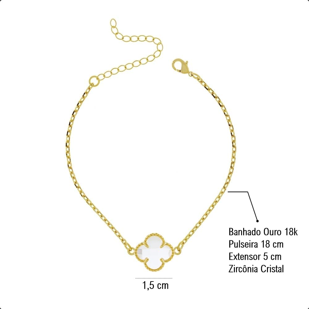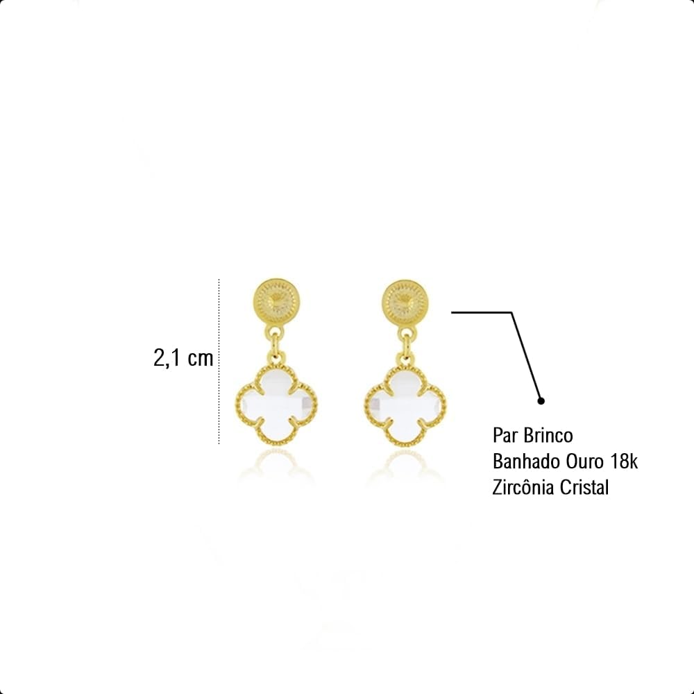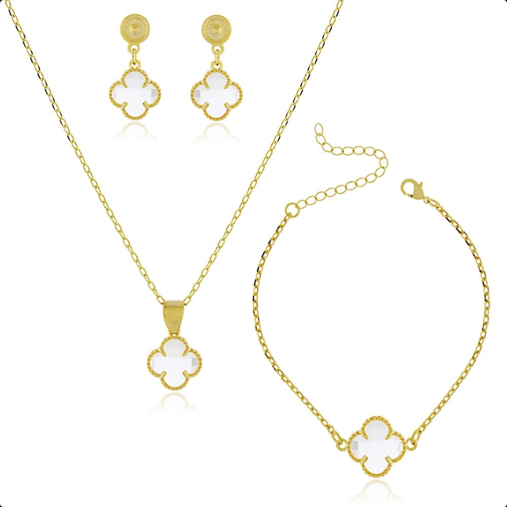Kit Colar, Pulseira e Brinco Banhado a Ouro 18k com Trevo Cristal
