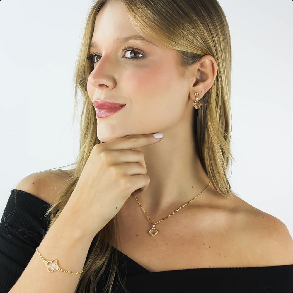 Transforme seu visual com o Kit Colar, Pulseira e Brinco Trevo Cristal Folheado a Ouro 18k – a escolha perfeita para quem ama semijoias modernas, sofisticadas e cheias de significado. Composto por colar com pingente de trevo, pulseira ajustável e brinco delicado, este conjunto une a leveza do design com a simbologia do trevo de quatro folhas, representando sorte, equilíbrio e elegância. A pedra cristal traz um brilho sutil e atemporal, realçado pelo banho dourado de alta qualidade, ideal para quem acompanha tendências sem abrir mão do estilo próprio. Use no trabalho, em momentos especiais ou no dia a dia com charme e leveza. Garanta já o seu e leve sorte, beleza e sofisticação para seus looks!