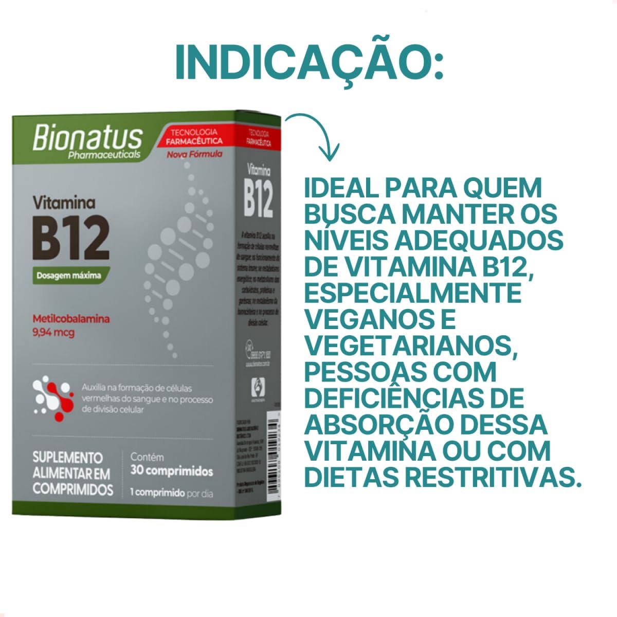 Bionatus, Vitamina B12, Suplemento alimentar, Metilcobalamina 9,94mg, 30 cápsulas • 30 doses, Cinza |