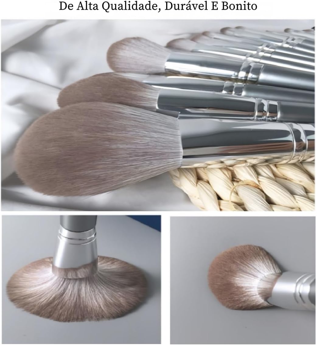Kit Profissional de Pincéis de Maquiagem 14 em 1, Cor Prata, Conjunto para Maquiagem de Festa e Contorno, Cerdas Sintéticas de Luxo e Cabo Resistente