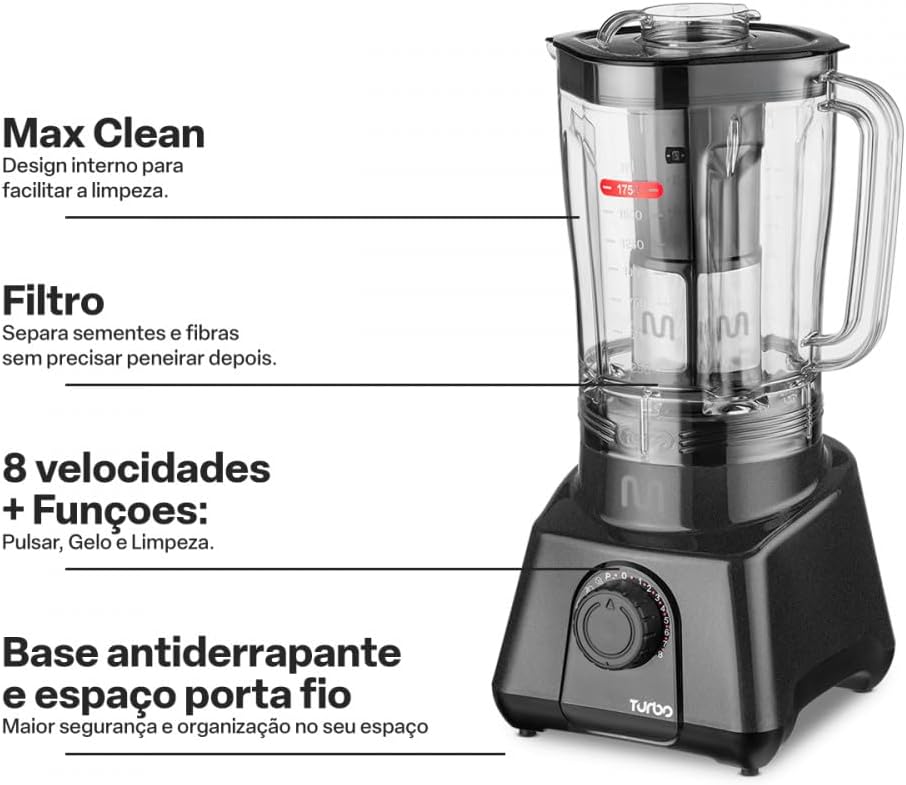 Mantenha sua cozinha organizada com o espaço prático para guardar o cabo de força. A base antiderrapante proporciona estabilidade durante o uso do Liquidificador Multi Turbo de 1.100 W.