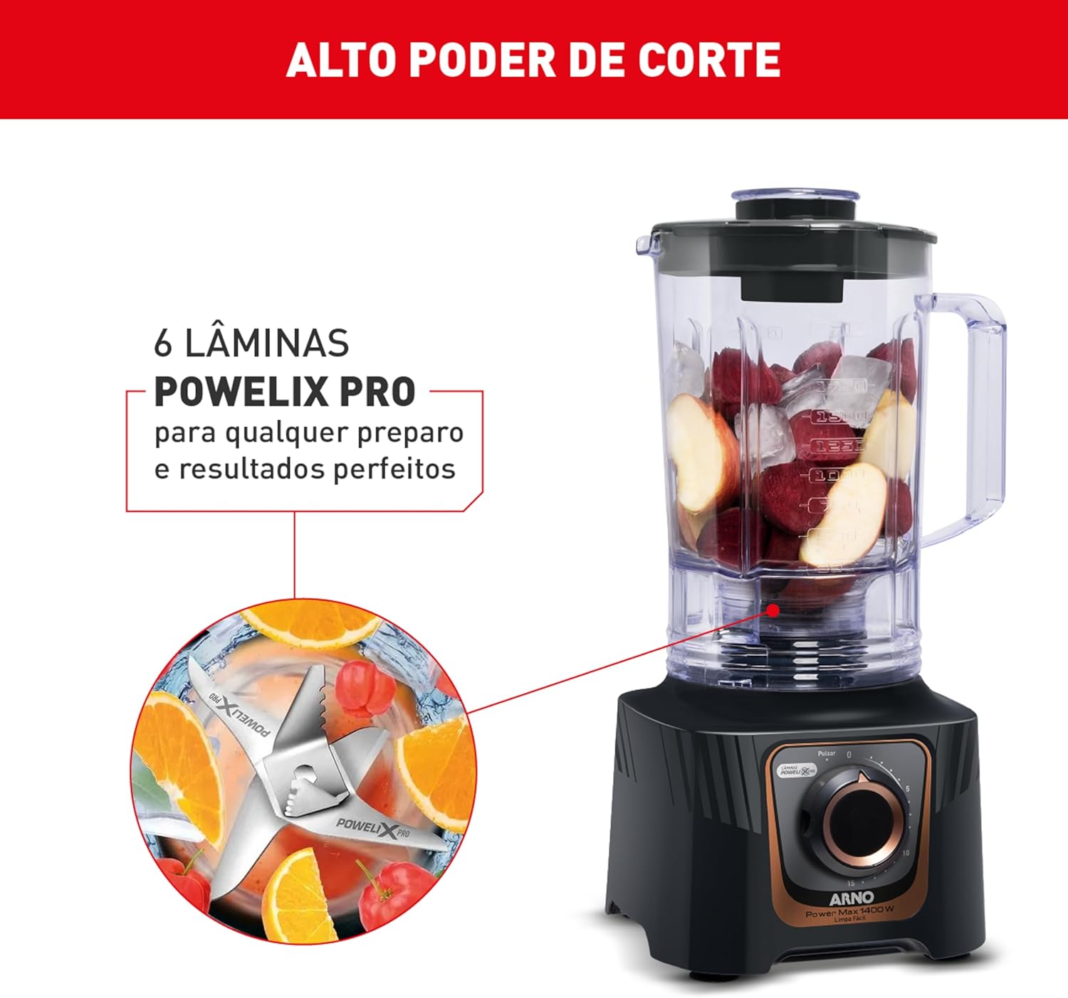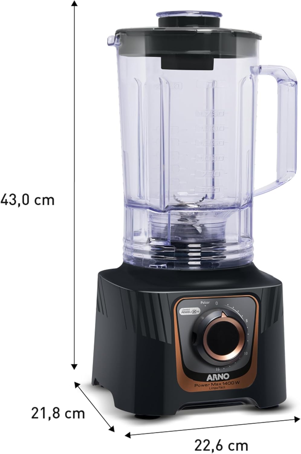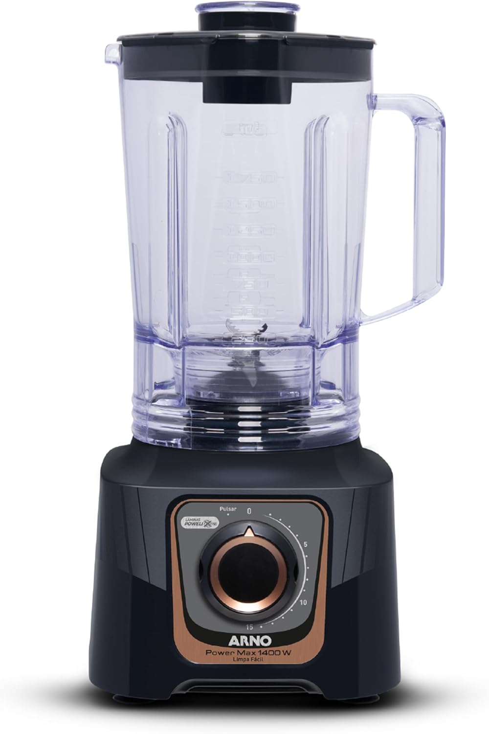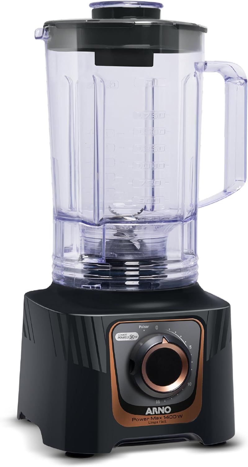 Liquidificador Arno Power Max 1400 Limpa Fácil com tecnologia exclusiva Autolock anti vazamento e seu sistema de lâmina removível. O novo Liquidificador Arno Power Max 1400 Autolock Limpa Fácil é o mais potente da Arno! Garanta os melhores resultados com toda a segurança e eficiência que só a Arno a oferece com a nova exclusiva tecnologia Autolock: prepare todos os tipos de refeições sem bagunça, graças ao dispositivo de travamento que só inicia o processamento após o encaixe correto da jarra. É menos desperdício e tempo gasto com limpeza! Conte com 15 velocidades para aperfeiçoar suas receitas e as exclusivas lâminas POWELIX PRO, as lâminas mais poderosas, duráveis e precisas até hoje desenvolvidas pela Arno. Com desempenho superior e qualidade da marca que é especialista há mais de 65 anos em liquidificadores, elas são 6 vezes mais eficientes, graças à sua ultraresistência, alto poder de corte e possui lâminas de corte na angulação correta para processar até os ingredientes mais duros e que podem ser usadas para diferentes preparos, sem que seja necessário pré-cortar em pequenos pedaços, garantindo a mistura perfeita de forma rápida e eficaz no dia a dia da sua cozinha. Com copo de 3,1 litros de capacidade, função pulsar, autolimpeza e painel moderno, o novo Liquidificador Arno Power Max 1400 Limpa Fácil tritura tudo, sem deixar pedaços e facilita a limpeza profunda do seu produto. Prepare sucos, sopas, molhos, vitaminas e muito mais e agilize a limpeza com o novo sistema Limpa Fácil que possibilita que você remova as lâminas de forma segura para limpar profundamente o copo. Basta desrosquear a base com as lâminas, lavar, fixar novamente e seu liquidificar está pronto para ser usado novamente! Você imagina, clic, a Arno faz.