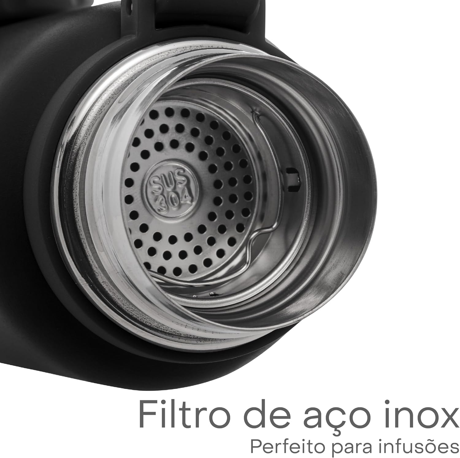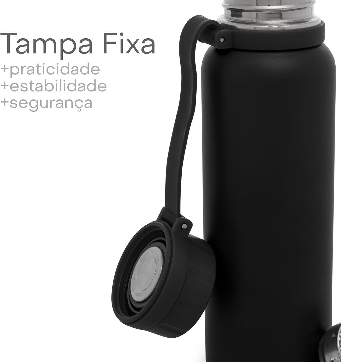 Estilo e elegância: O acabamento em preto oferece um visual moderno e sofisticado, adequado para qualquer ambiente. A garrafa térmica preta é não só funcional, mas também um acessório de estilo que complementa seu dia a dia.