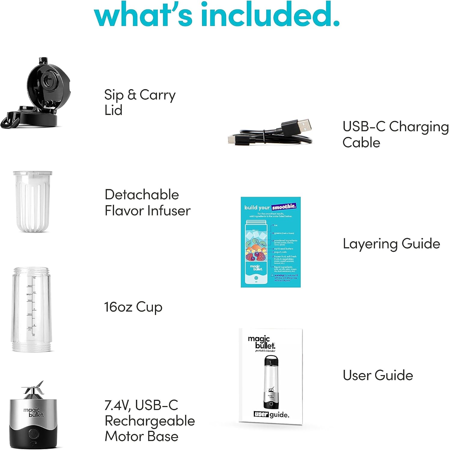 Base de motor recarregável, copo de 473 ml, infusor de sabor destacável, tampa para beber e carregar, cabo de carregamento USB-C, guia de camadas, guia do usuário |