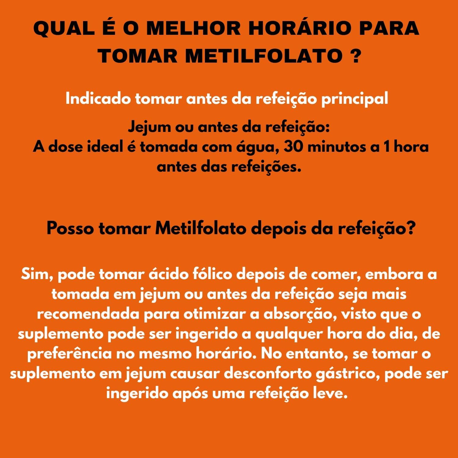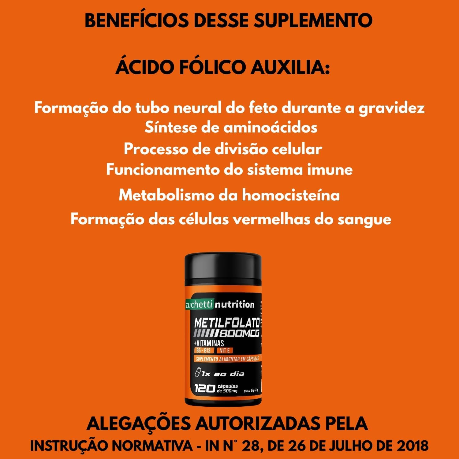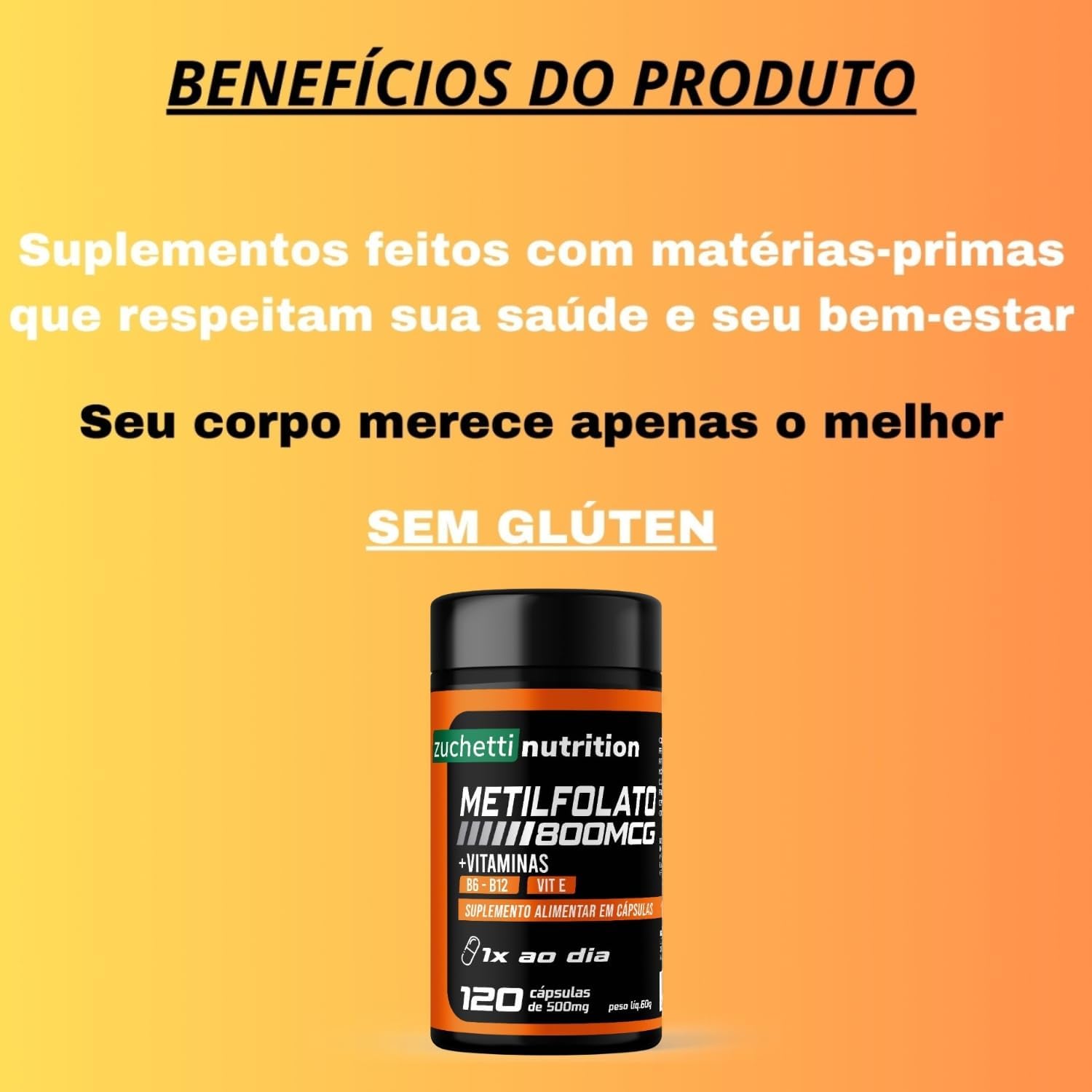 Na Zuchetti Nutrition, entendemos que a nutrição é a base para uma vida mais saudável, equilibrada e ativa. Por isso, nossos suplementos são desenvolvidos com os mais altos padrões de qualidade e segurança para oferecer confiança. Trabalhamos com uma linha completa de produtos pensados para atender suas necessidades, seja para quem busca melhorar o desempenho nos treinos, complementar a alimentação ou alcançar metas de saúde específicas. Nossos diferenciais: Qualidade Premium: Nossos produtos são feitos com ingredientes selecionados, seguros e de alta qualidade, para garantir uma suplementação eficaz. Inovação e Ciência: Todos os suplementos são desenvolvidos com base em pesquisas científicas, garantindo eficácia e eficiência em cada dose. Compromisso com o Bem-Estar: Na Zuchetti Nutrition, a nossa missão é ajudar nossos clientes a atingirem seu melhor potencial físico e mental, com saúde e segurança. Com a Zuchetti Nutrition, você tem ao seu lado a força da nutrição e da ciência para alcançar seus objetivos com confiança. Quer saber mais? Visite nossa página e conheça os suplementos que farão a diferença no seu dia a dia. CONTÉM : 120 cápsulas CONSUMIR UMA CAPSULA AO DIA, OU CONFORME ORIENTAÇÃO MÉDICA. INGREDIENTES: L-metilfolato de cálcio ( Ácido Fólico), metilcobalamina (Vitamina B12) , cloridrato de piridoxina (Vitamina B6) acetato de DL-alfa-tocoferol (Vitamina E) Antiumectante: dióxido de silício. Excipiente: Amido de milho. Composição da cápsula: Gelatina e umectante glicerina. NÃO CONTÉM GLÚTEN. QUAL É A DATA DE VALIDADE DO PRODUTO? Esse suplemento é fabricado com prazo de validade de 2 anos. O melhor horário para consumir: tomar antes da refeição principal, Posso tomar Metilfolato depois da refeição? Sim, pode tomar ácido fólico depois de comer, embora a tomada em jejum ou antes da refeição seja mais recomendada para otimizar a absorção, visto que o suplemento pode ser ingerido a qualquer hora do dia, de preferência no mesmo horário. No entanto, se tomar o suplemento em jejum causar desconforto gástrico, pode ser ingerido após uma refeição leve. Esse produto não é um medicamento. Esse produto é um suplemento alimentar em cápsulas. Manter fora do alcance das crianças, destinado a pessoas acima de 19 anos. Não pode ser consumido por gestantes, lactantes e crianças. Produto dispensado de registro conforme RDC 240/2018. Manter em local seco e arejado.