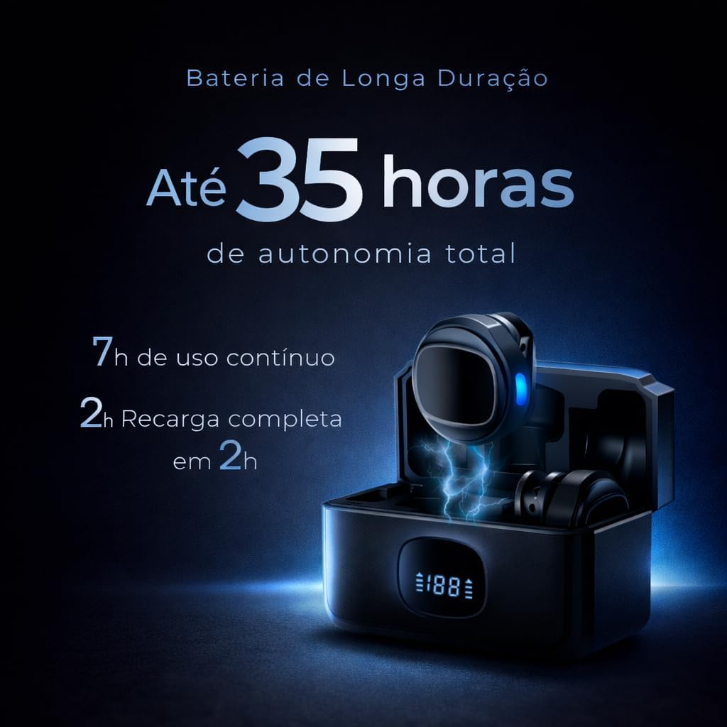 🔋 Case Inteligente com Display Digital Integrado O estojo de carregamento possui visor digital que exibe nível de bateria L e R individualmente agregando controle total e segurança operacional. A base compacta garante recarga eficiente e armazenamento sofisticado elevando percepção de tecnologia avançada.
