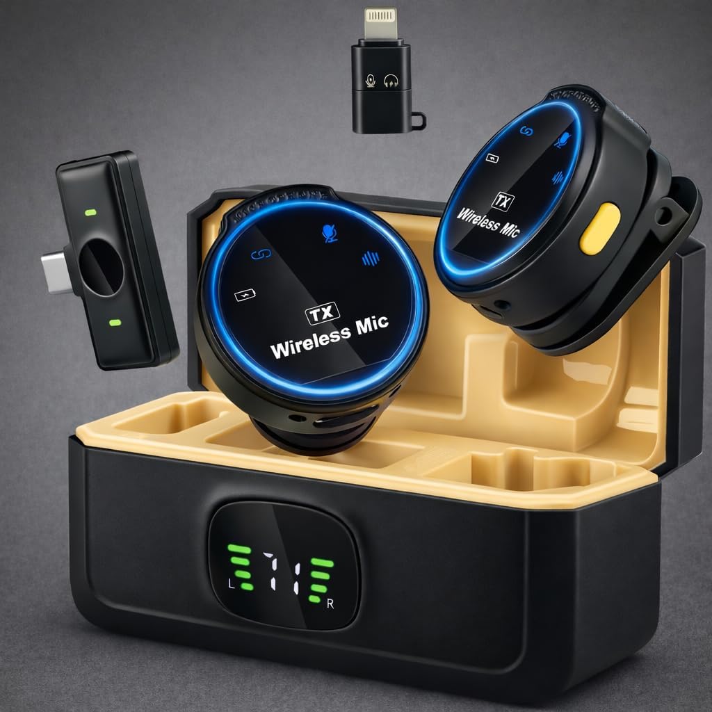 Microfone Lapela Profissional Cancelamento Premium de Ruído Wireless Duplo 48kHz Display Digital Case Carregamento USB C Lightning Streaming