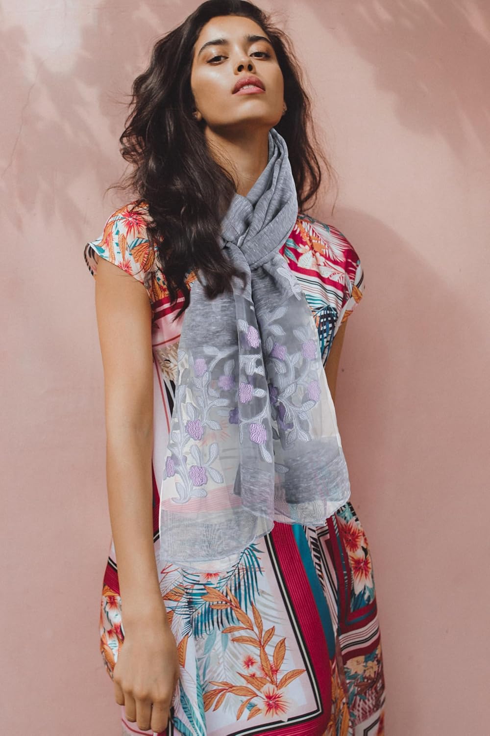 Este cachecol tem uma variedade de modelos; Padrão floral bordado delicado com design de cores brilhantes, é um ótimo presente para entusiastas de arte ou cômoda eclética.