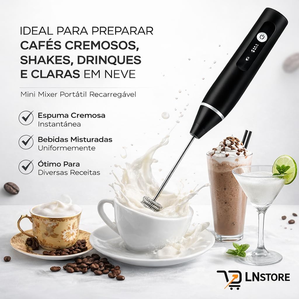 Mini mixer elétrico portátil recarregável com 3 velocidades. Ideal para bebidas, ovos e receitas rápidas. Inox, sem fio e USB – Qualidade Premium LNSTORE